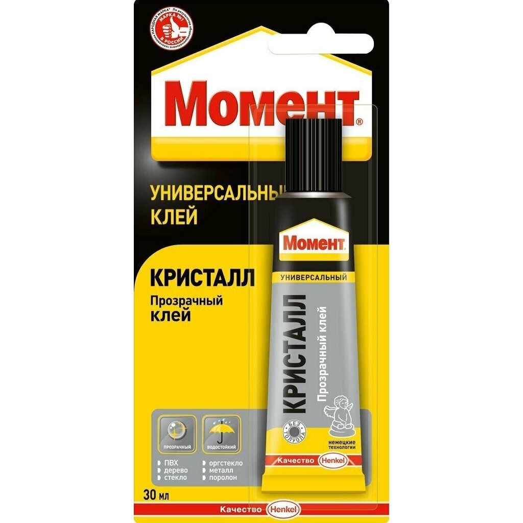 Момент Кристалл особенно хорошо подходит для склеивания мягкого и жесткого поливинилхлорида, полистирола, оргстекла и других пластиков, в различных сочетаниях склеивает дерево, металл, резину, бумагу, картон, полиуретан, пробку, поролон, фарфор, керамику, стекло, кроме посуды, контактирующей с пищей. Не подходит для стиропора, полиэтилена и полипропилена. Является прозрачным, водостойким, обеспечивает высокую прочность склеивания.