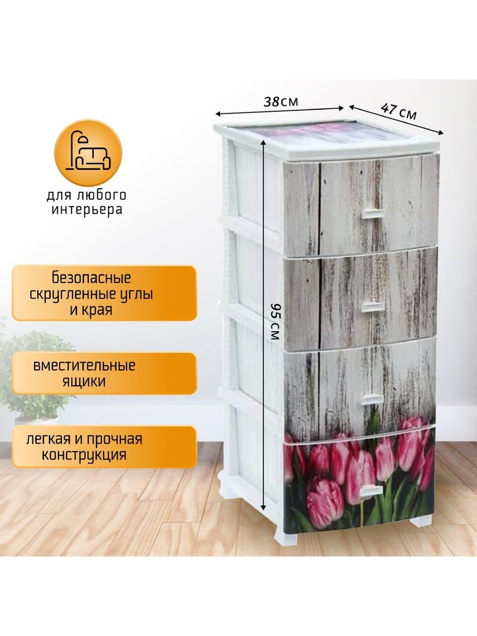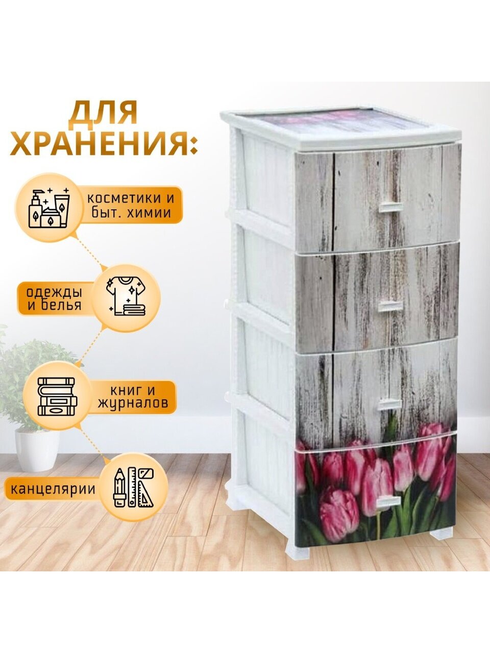 Комод из пластика с четырьмя выдвижными ящиками гармонично впишется в интерьер любой комнаты. Он предназначен для хранения вещей и продуктов питания. Легкий и вместительный комод поможет обеспечить порядок в доме. Рисунок на передних панелях придаст индивидуальность и подарит настроение. Не рекомендуется размещение близи батарей центрального отопления и электрических обогревателей.