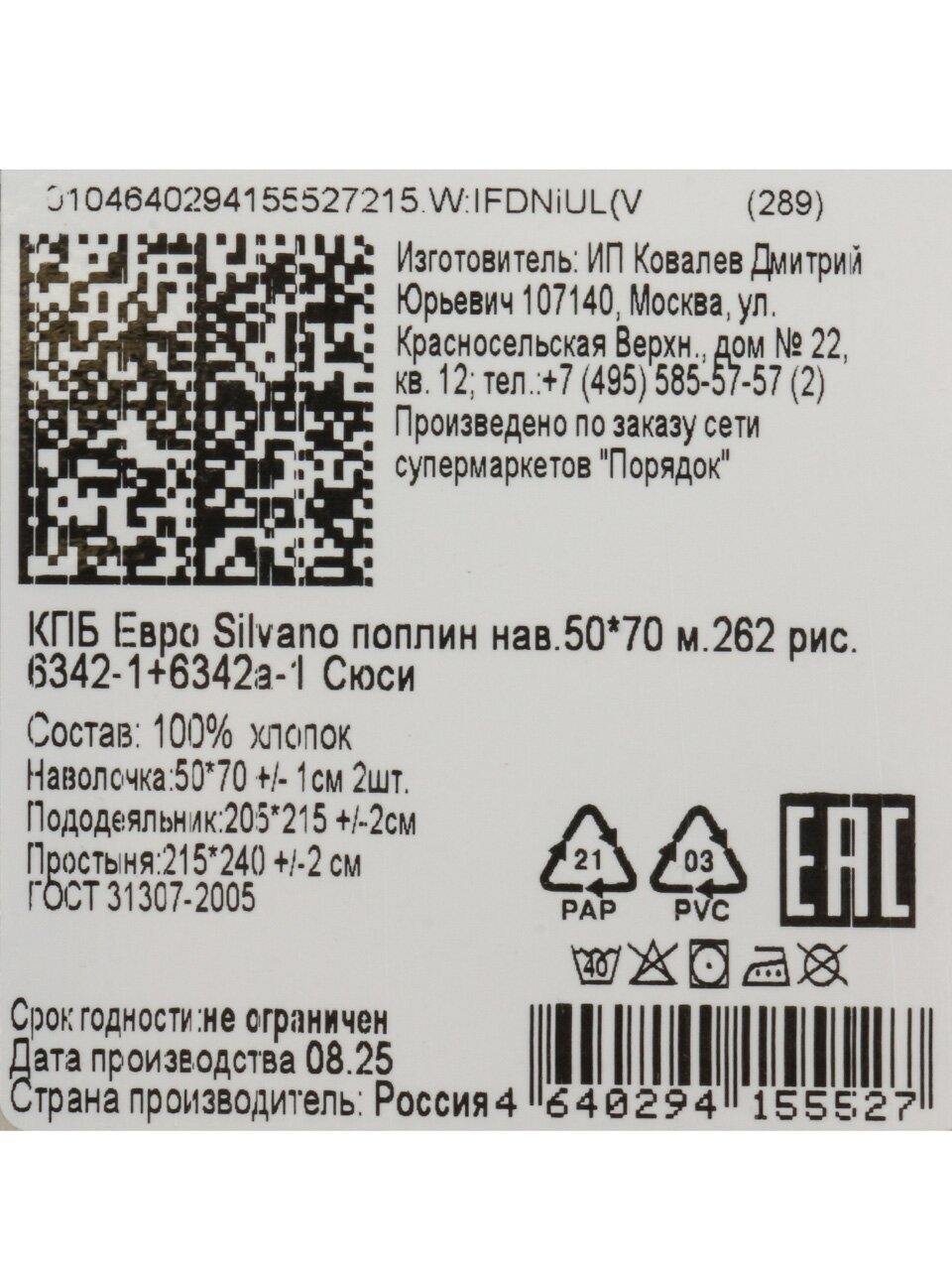 Вы можете приобрести «Постельное белье евро, простыня 215х240 см, 2 наволочки 50х70 см, пододеяльник 205х215 см, Silvano, поплин, Сюси» и другие товары в нашем интернет-магазине в Иваново по низким ценам и с бесплатным самовывозом.