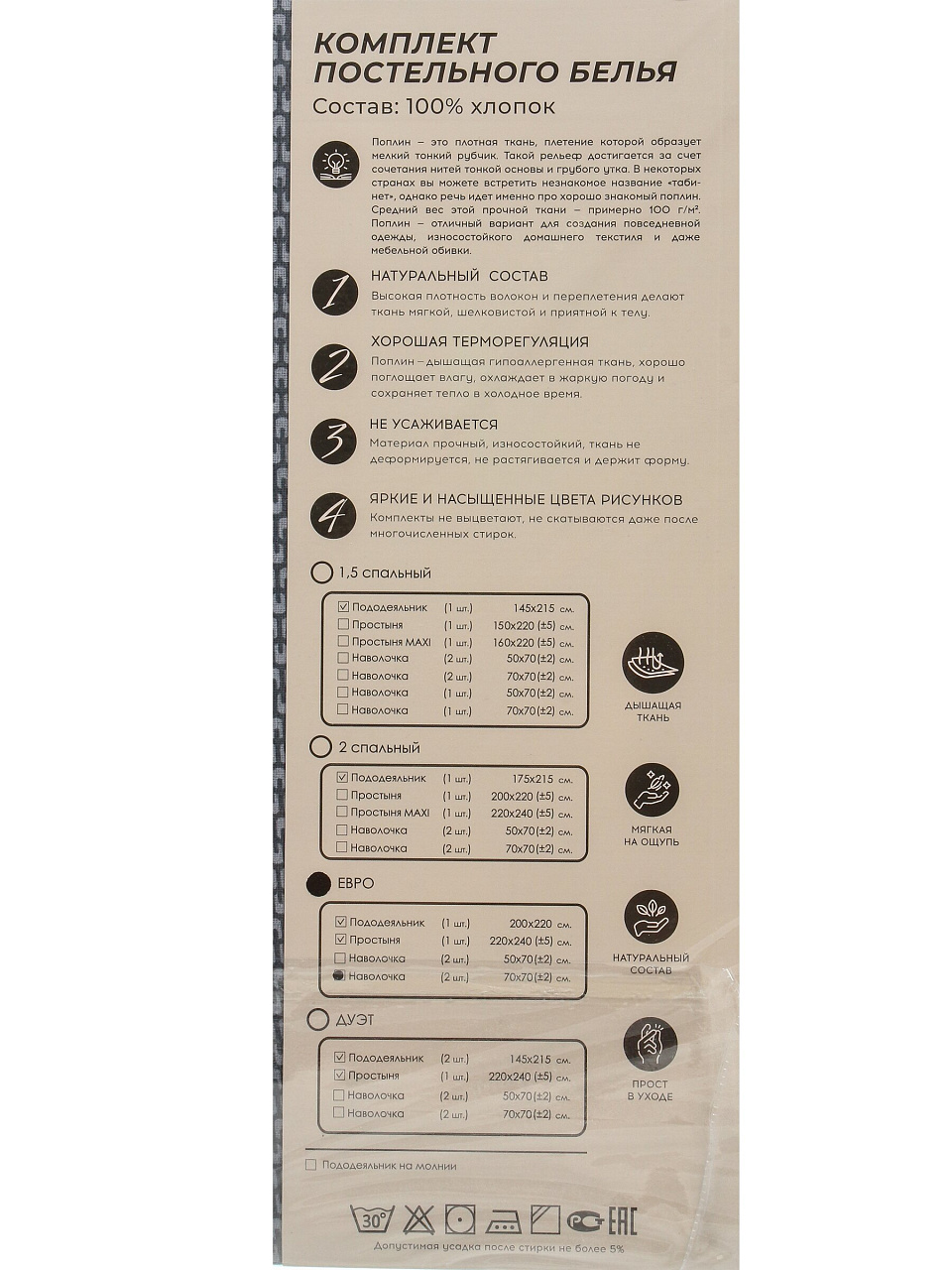 - Практичные размеры: евро-комплект 220х240 см, пододеяльник 200х220 см, две наволочки 70х70 см — удобно для больших кроватей.