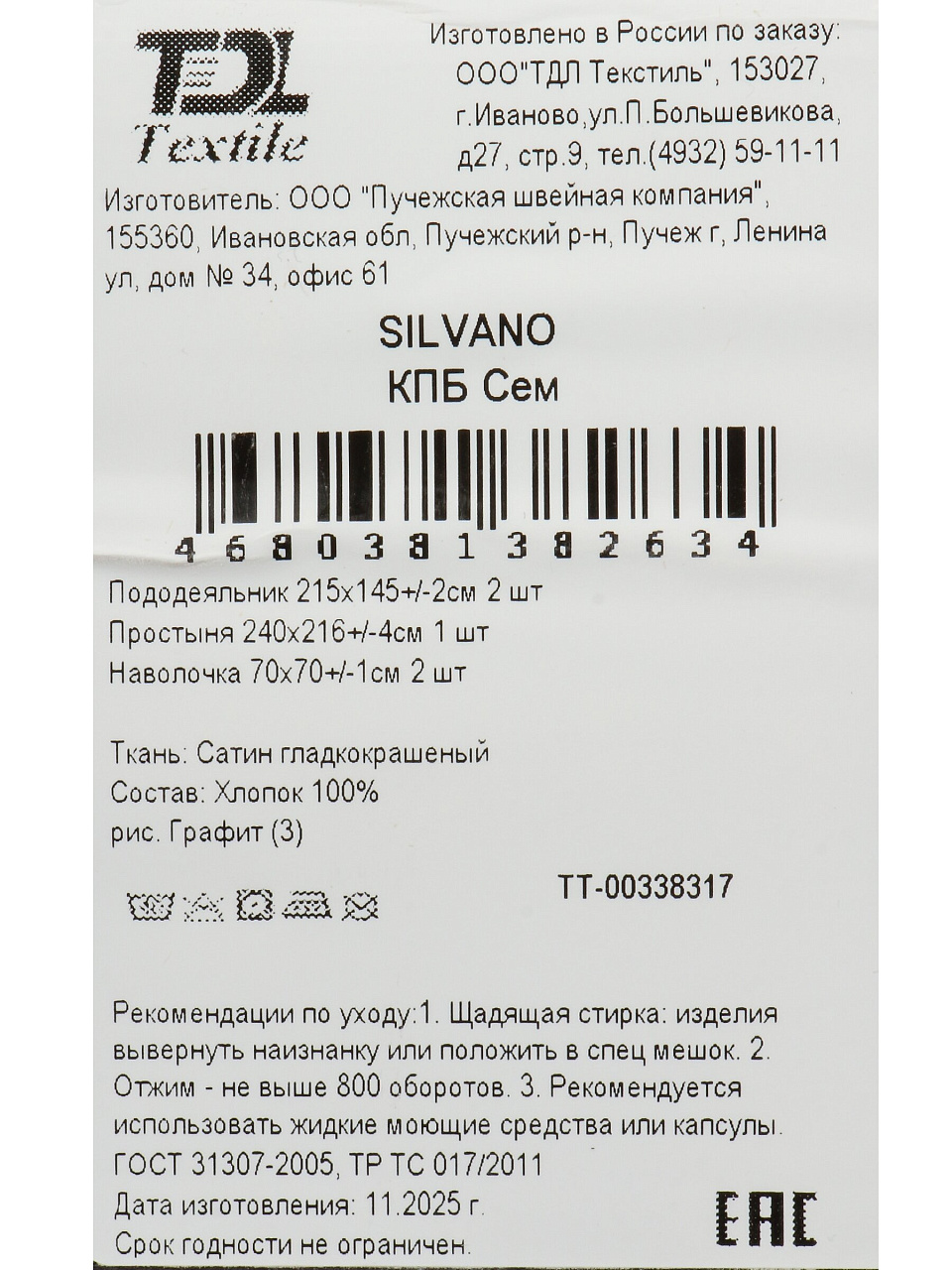 Семейное постельное белье Silvano «Графит» (сатин, 5 предметов): премиальный хлопок, идеальный размер для двоих, стильный подарок в подарочной упаковке.