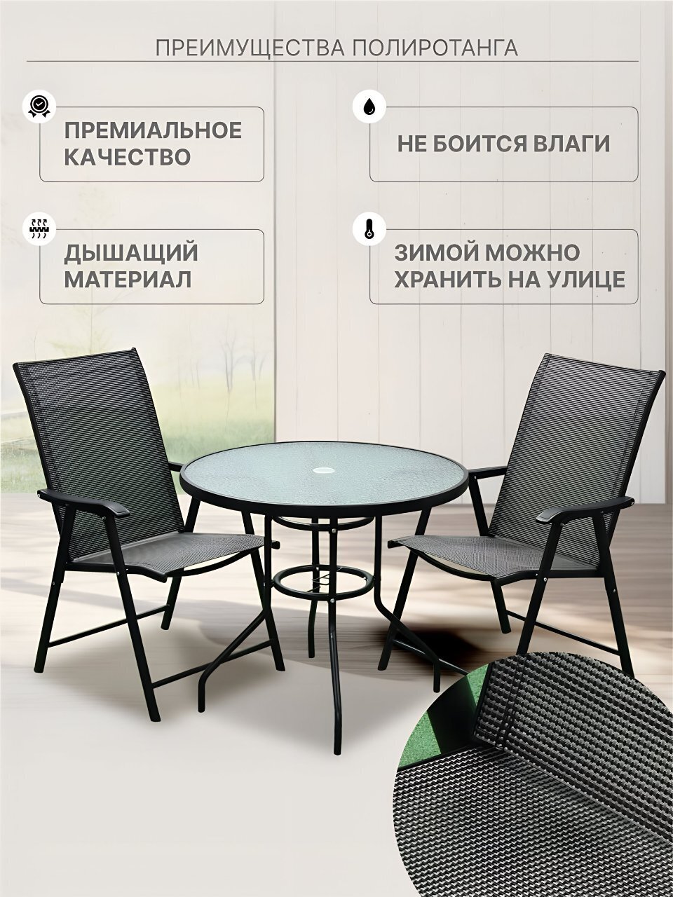 Мебель не ржавеет, не гниет, не выцветает на солнце. Она прекрасно переносит любые погодные условия и сохраняет свою форму и цвет на долгие годы.