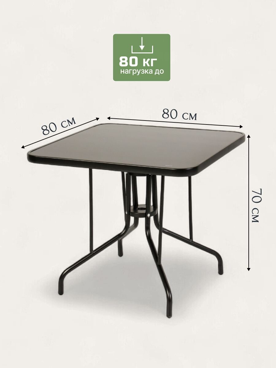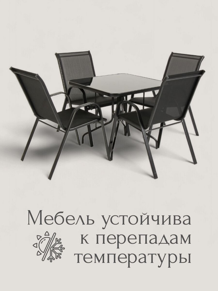 Садовая мебель Тиба — стильное и практичное решение для обустройства дачного участка, террасы, уличного кафе или домашней кухни. Современный дизайн и универсальный черный цвет гармонично впишутся в любой ландшафт или интерьер, подчеркивая вкус и заботу о комфорте. Комплект состоит из квадратного стола размером 80х80х70 см со столешницей из прочного стекла и четырех удобных стульев с жестким сиденьем (размер стула — 59х58х95 см). Такой набор рассчитан на комфортное размещение четырех персон, что идеально подходит для семейных обедов и дружеских встреч на свежем воздухе.