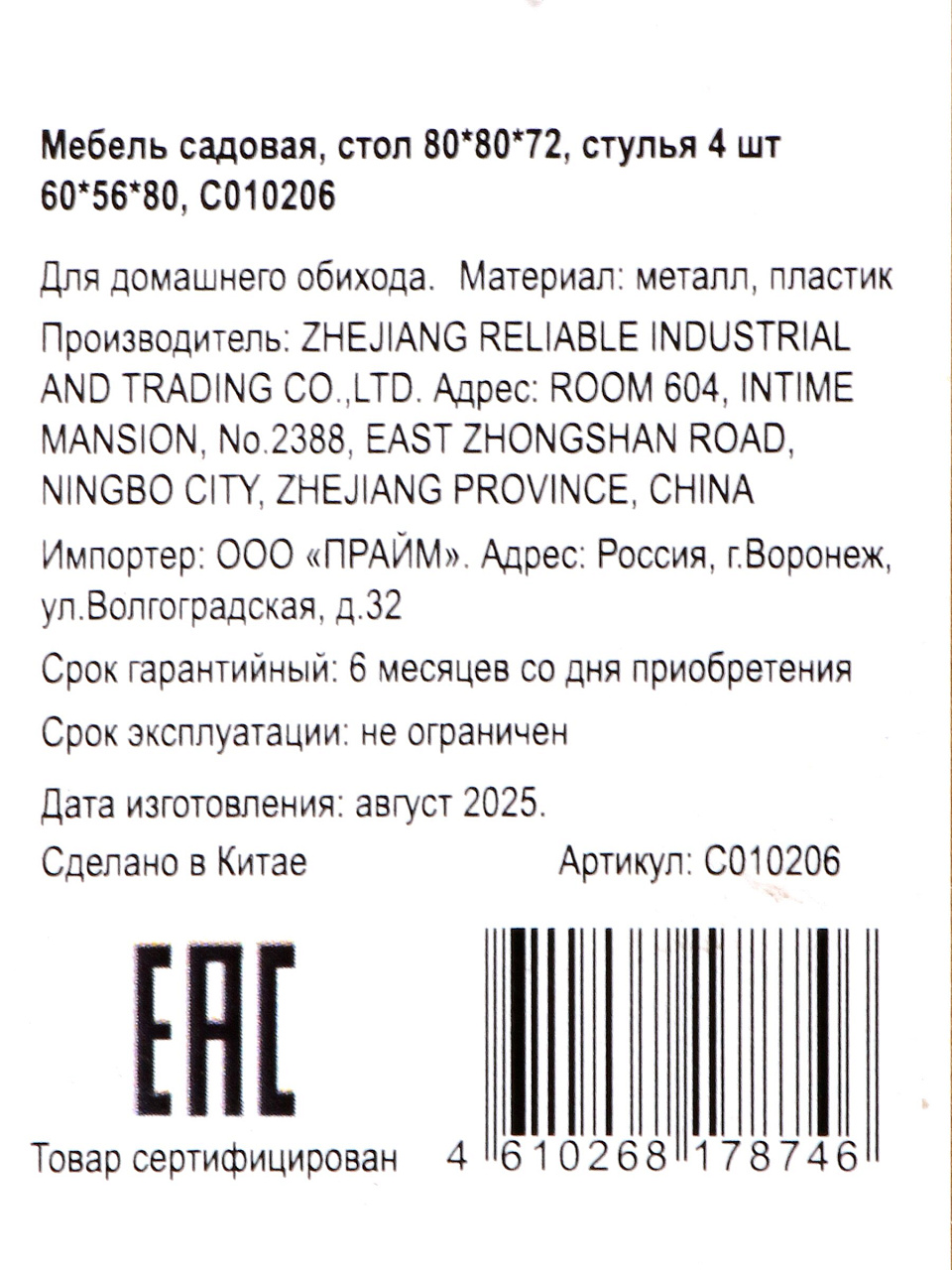 Какой размер у стола и стульев в этом садовом комплекте?