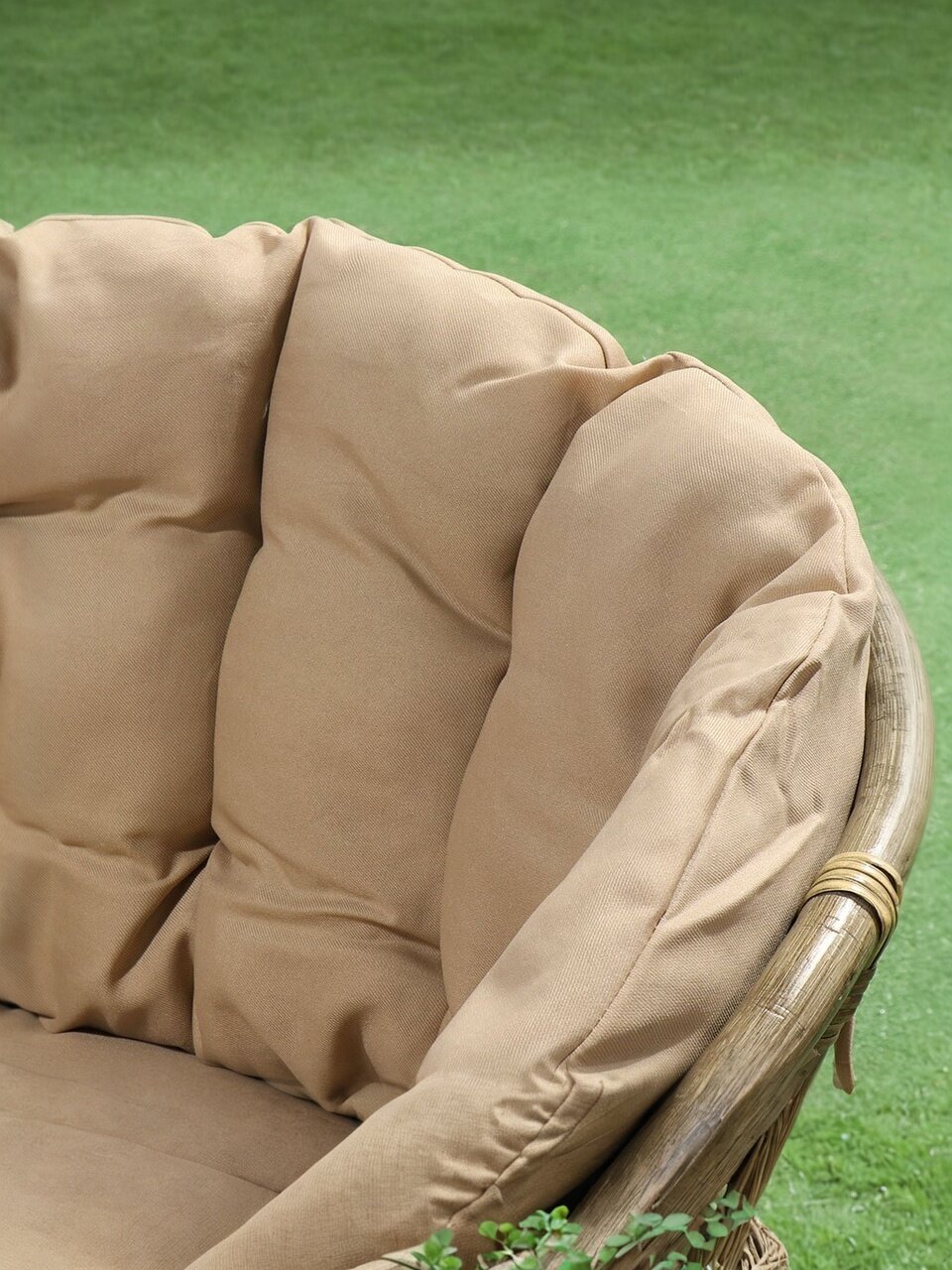 - Эксклюзивный дизайн: комплект включает стол 55х55х56 см, два кресла и диван с подушками цвета беж — гармония уюта и эстетики для сада или веранды