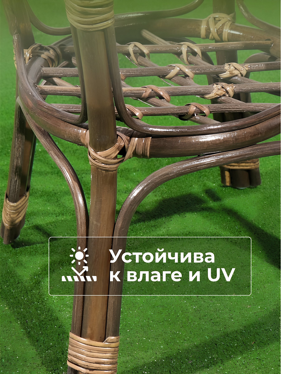 Комплект изготовлен из прочного материала, устойчивого к влаге и солнцу, подушки съемные и легко стираются — уход занимает минимум времени.