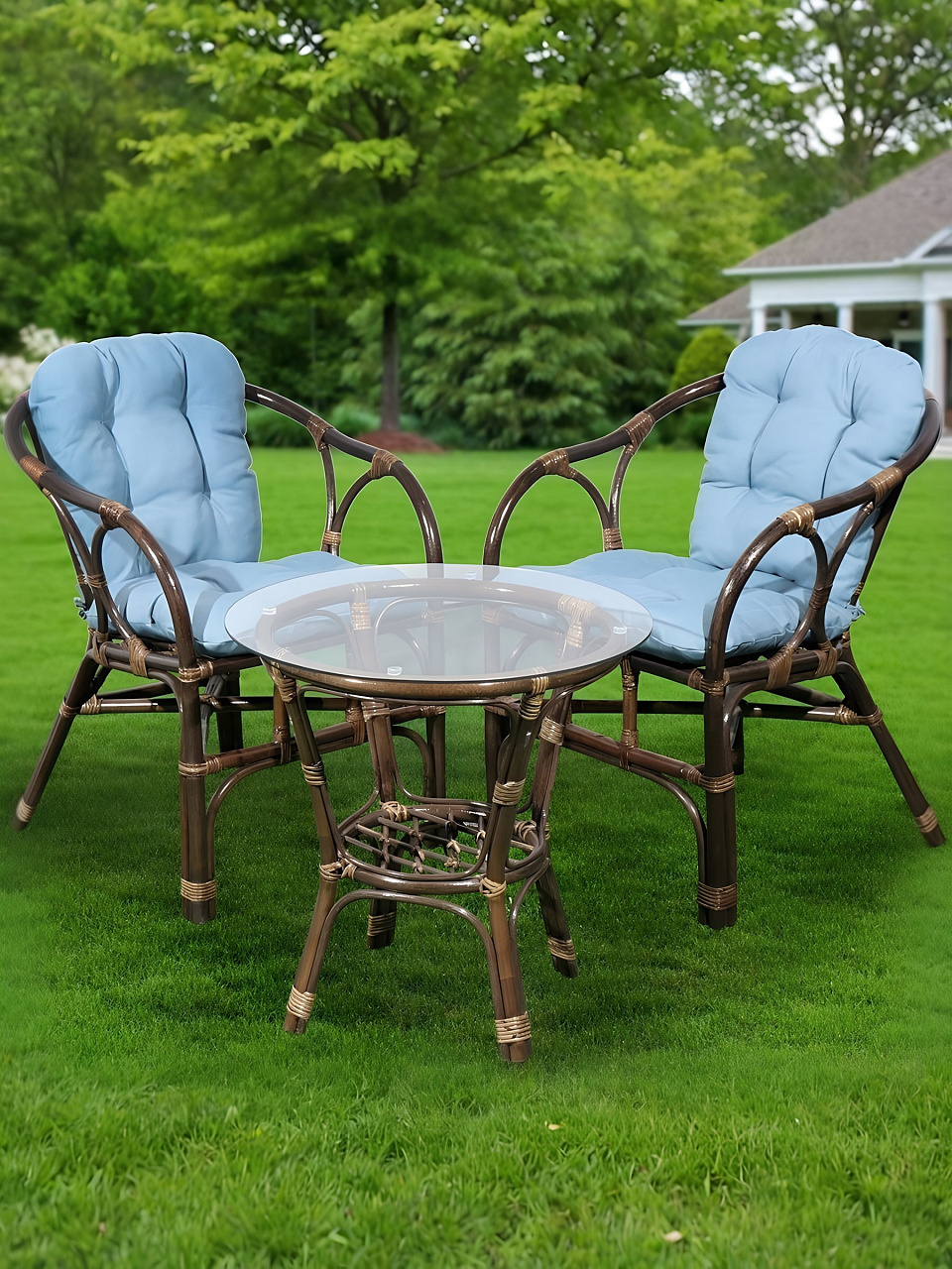 Комплект садовой мебели Сиеста ЛЮКС — оптимальный выбор для тех, кто ищет недорогую, но стильную мебель для дачи или балкона. Стол и два кресла с мягкими голубыми подушками обеспечивают комфорт даже при длительном использовании. Размеры стола 50.2х50.2х55.3 см позволяют использовать его как кофейный столик или для сервировки легких закусок на свежем воздухе. Комплект легко впишется в любой интерьер — от классического сада до современной террасы.