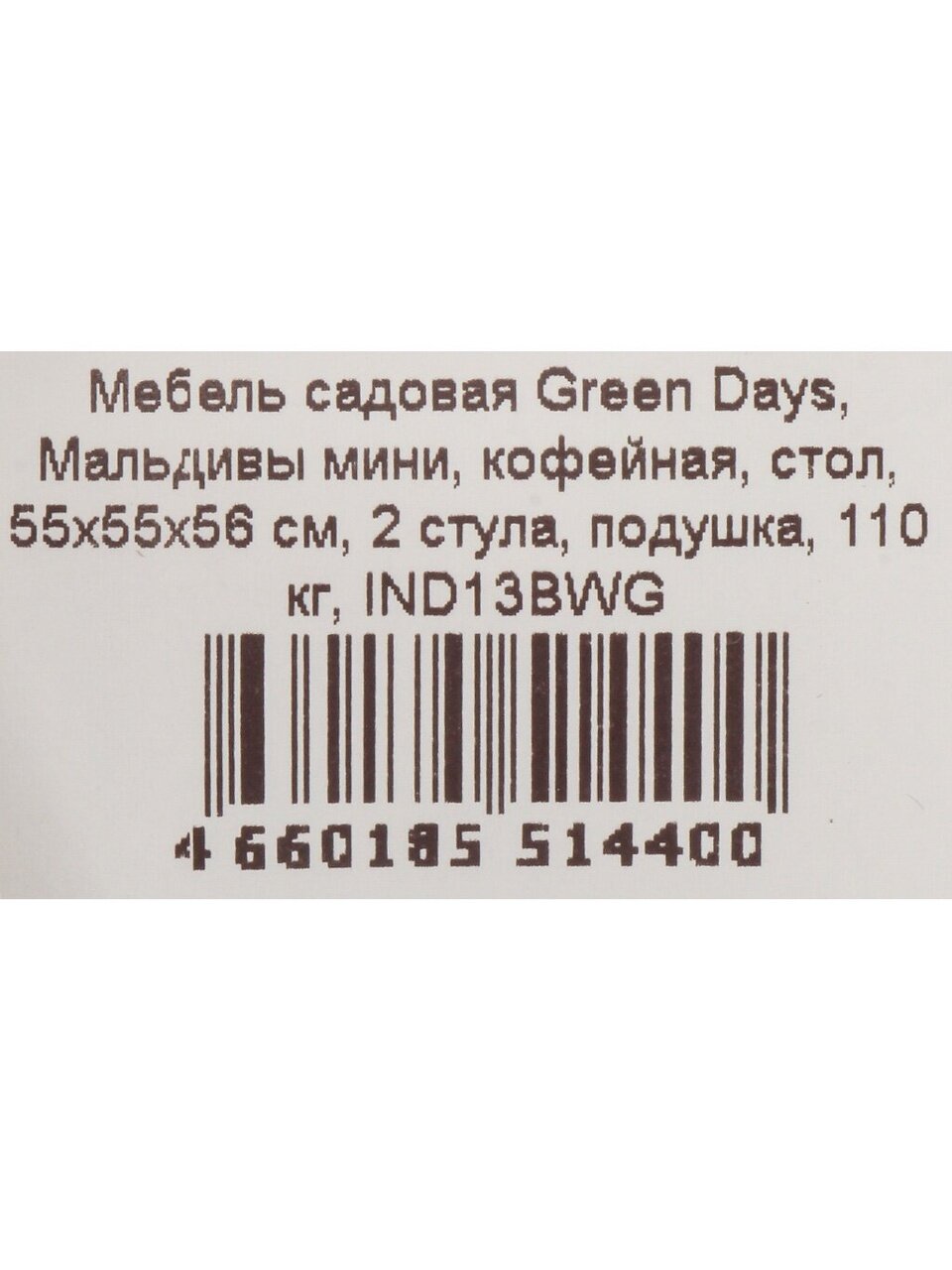 Вы можете приобрести «Мебель садовая Green Days, Мальдивы мини, кофейная, стол, 55х55х56 см, 2 стула, подушка, 110 кг, IND13BWG» и другие товары в нашем интернет-магазине в Шахтах по низким ценам и с бесплатным самовывозом.