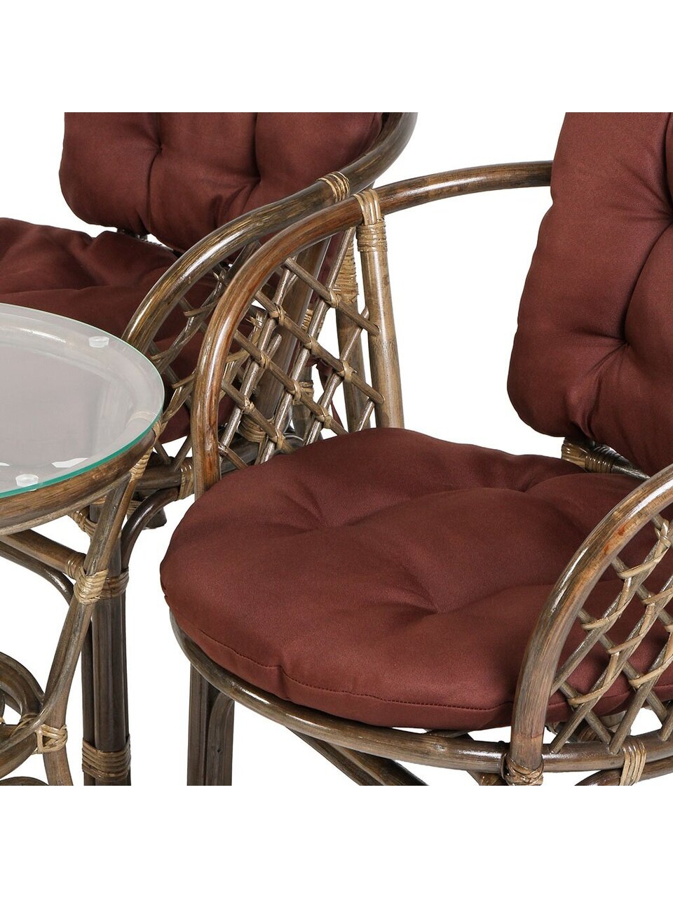 Комплект садовой мебели из натурального ротанга экологичен, комфортен и красив. Плетеная мебель - это неповторимый стиль и уютная атмосфера, создающая умиротворенность и расслабленность. Лоза ротанга чарует своей невероятной теплотой и декоративностью. Легкое ажурное переплетение ротанга и прозрачная стеклянная столешница придают мебели невесомый, воздушный вид.