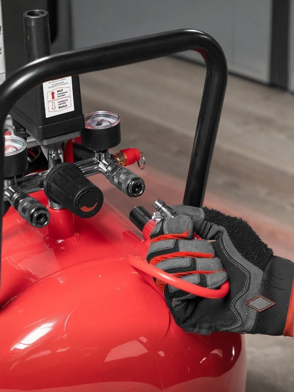- Удобный контроль рабочих параметров — 2 манометра и регулятор позволяют отслеживать и корректировать давление для корректной работы пневмоинструмента.