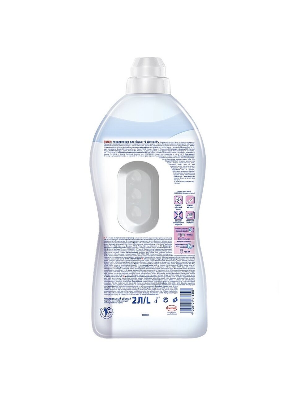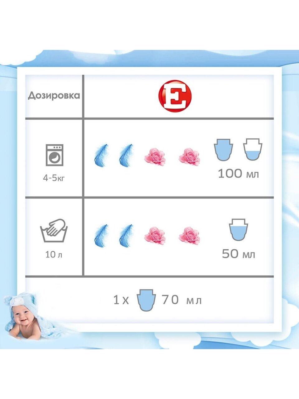 С кондиционером для детей вещи будут всегда мягкими и приятными на ощупь. Подходит для всех видов тканей. Избегайте непосредственного контакта средства для стирки с тканью.