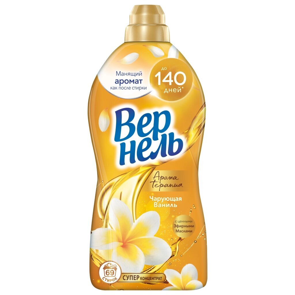 Концентрированный кондиционер для белья Вернель Ароматерапия Чарующая ваниль 1740 мл (69 стирок) подарит Вашему белью не только невероятную мягкость, но и магический аромат сладких цветков ванили, а благодаря специальным аромакапсулам в составе кондиционер для стирки Вернель позволит наслаждаться интенсивным ароматом белья до 140 дней.
