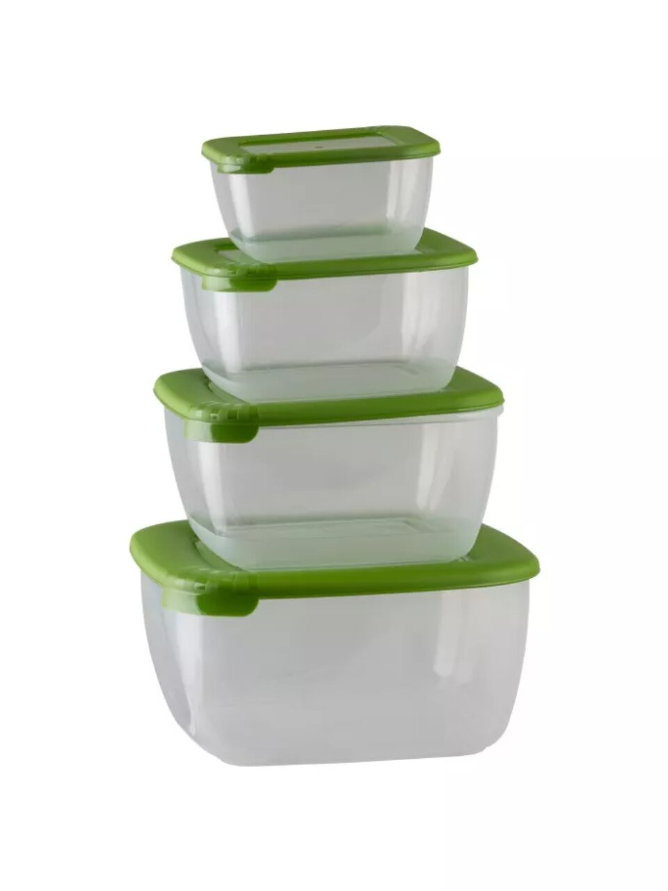 В комплекте 4 контейнера объёмом 0.46, 0.95, 1.5 и 2.5 литра, каждый высотой 10 см, с крышками, цвета в ассортименте.