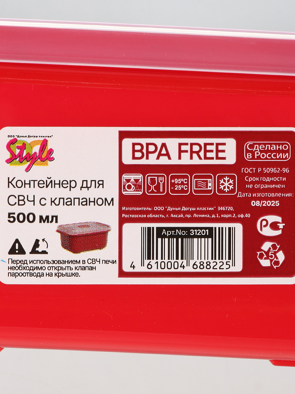 Контейнер пищевой пластик, 0.5 л, 14.5х10.2х6.5 см, красный, прямоугольный, с клапаном, DDStyle, 31201