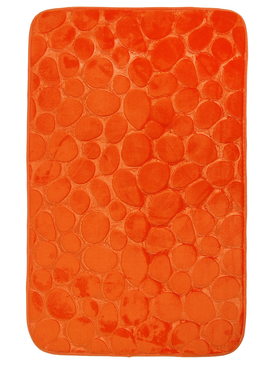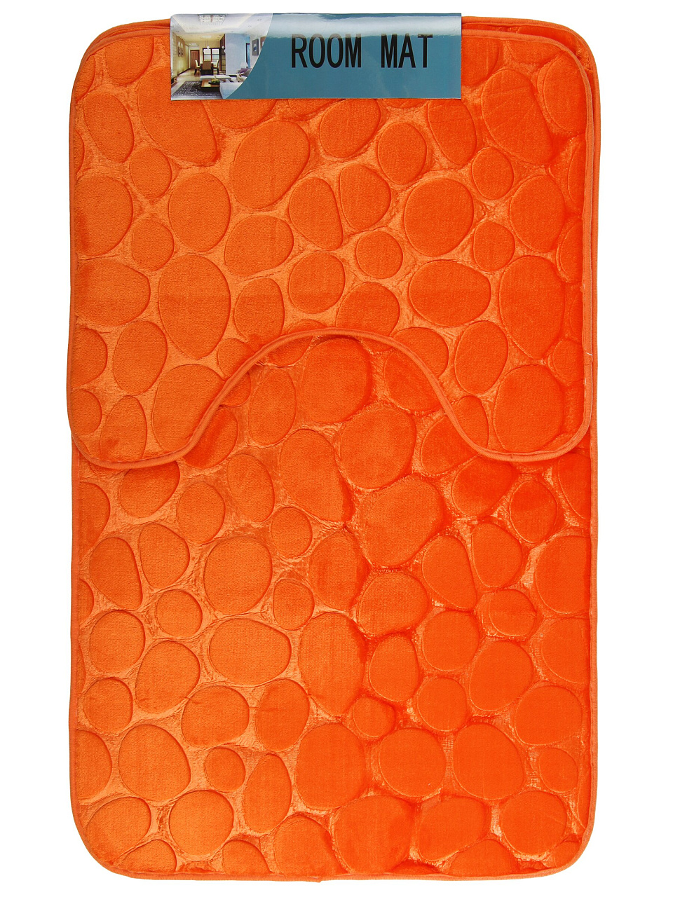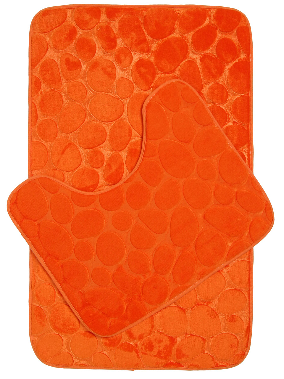 В комплекте два коврика: 50×80 см и 40×50 см. Цвет — насыщенный оранжевый с рисунком «Камешки», форма — прямоугольная. Такой набор подходит для стандартных ванных комнат и туалетов.