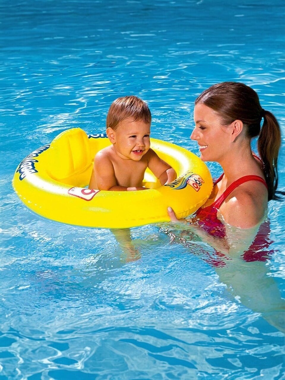 Чтобы детки уверенно держались на воде и легко покачивались на волнах рядом с родителями, пригодится надувной плотик.