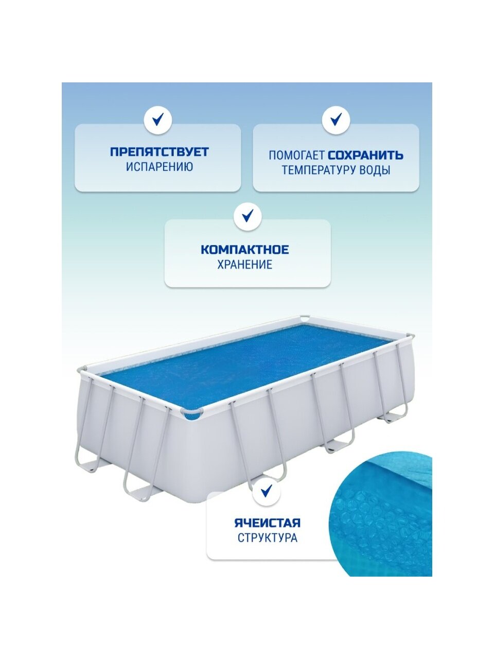 - ускоренный нагрев воды: благодаря воздушно-пузырчатой пленке, тент эффективно сохраняет тепло, что позволяет быстрее нагревать воду под воздействием солнечных лучей;