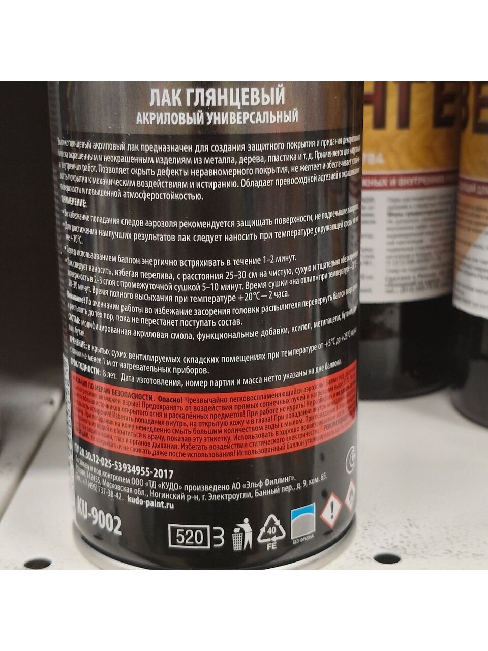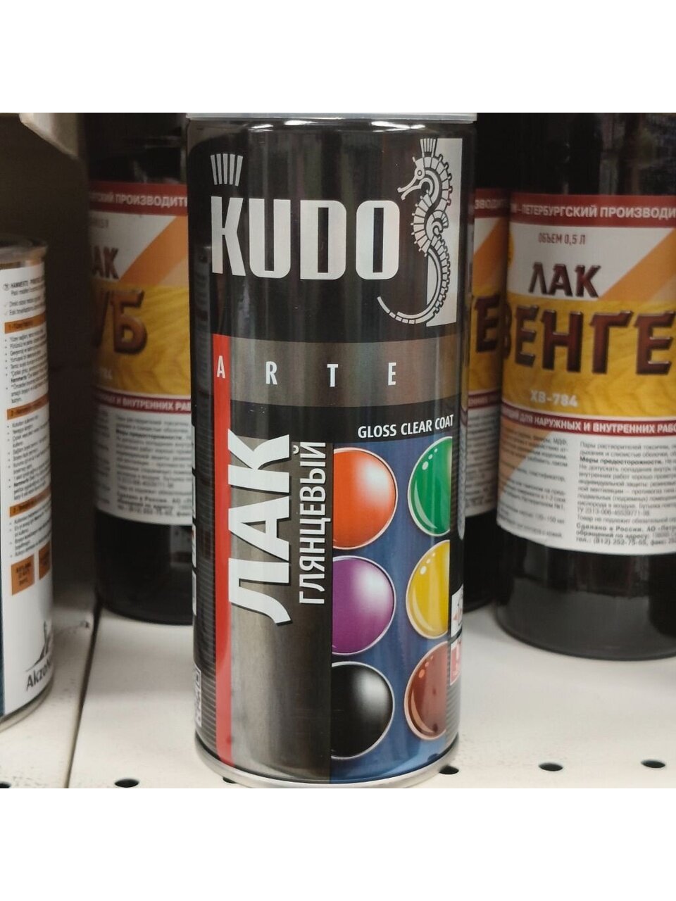 Высокоглянцевый универсальный аэрозольный акриловый лак KUDO в баллончике предназначен для создания защитного покрытия и придания декоративного блеска окрашенным и неокрашенным изделиям из металла, дерева, пластика и т.д.