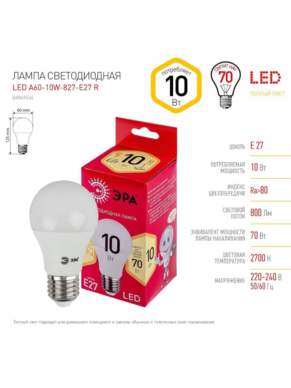 Светодиодная лампа ЭРА серии R мощностью 10 Вт с цветовой температурой 2700 K в цоколе E27 обладает теплым свечением, комфортным для глаз (температура наиболее приближена к утреннему или полуденному солнцу).