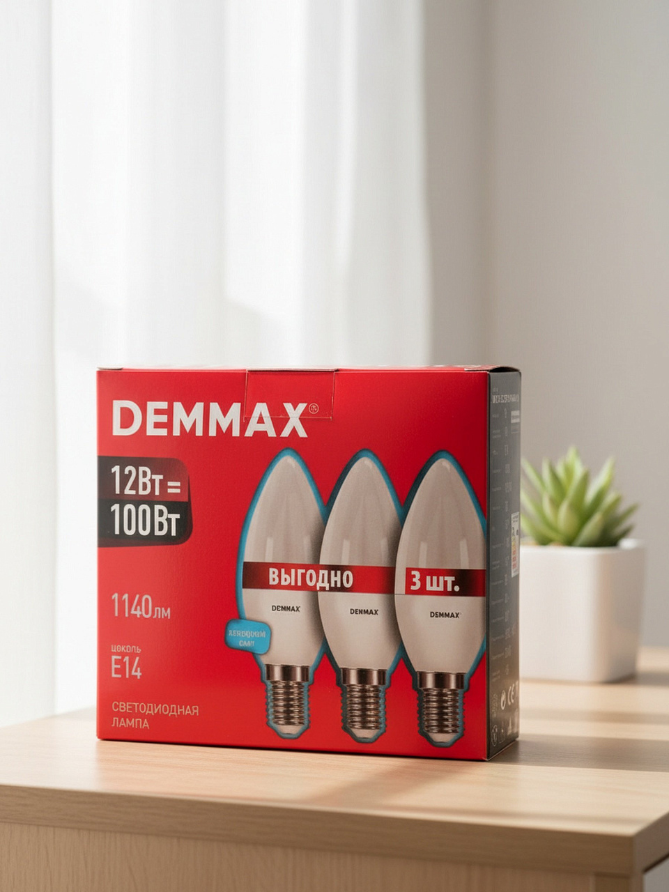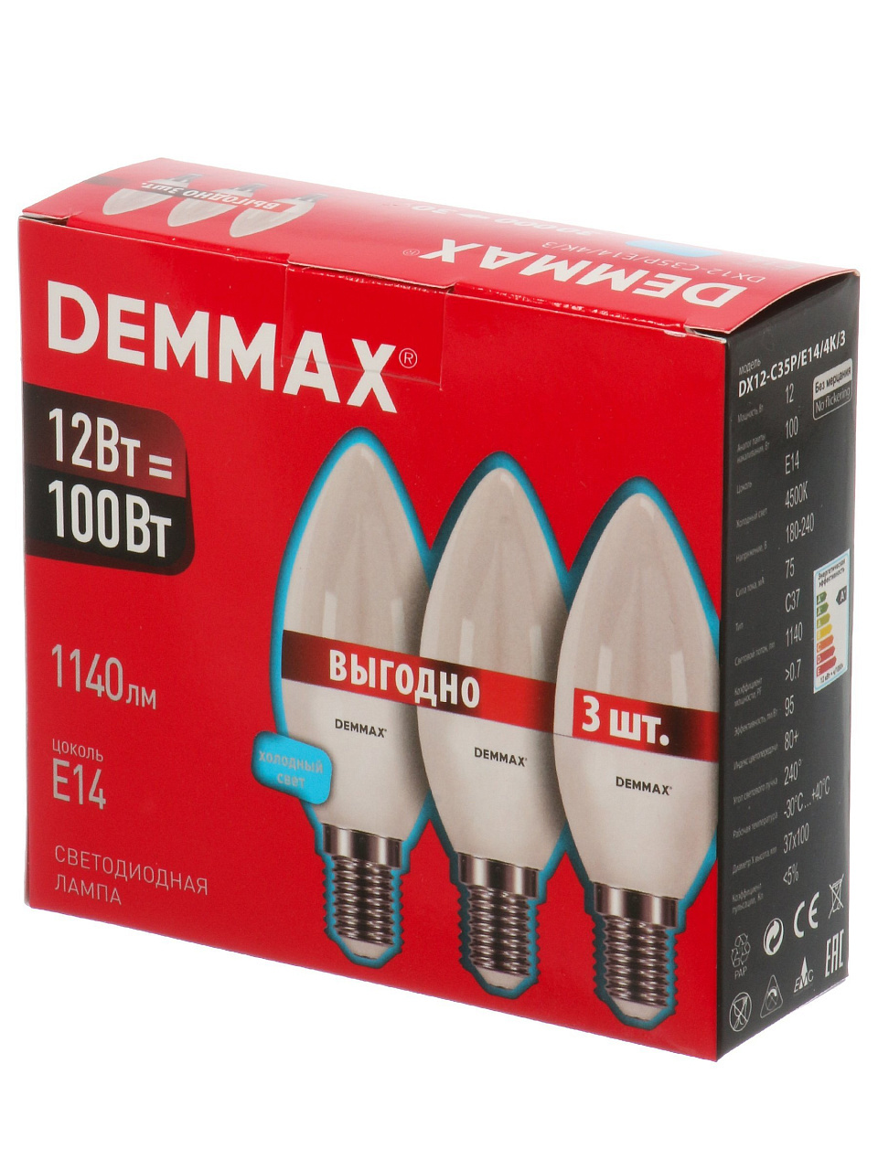 Лампа светодиодная E14, 12 Вт (аналог 100 Вт), 4500K, свеча, DEMMAX — экономьте до 85% энергии и получайте комфортный нейтральный свет для дома или дачи. В упаковке 3 шт.
