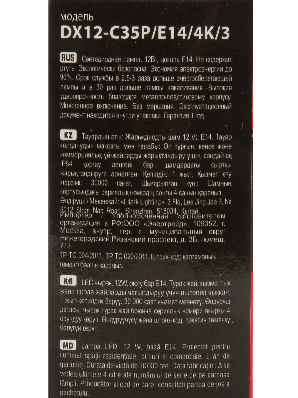 - Компактность и универсальность — стандартный цоколь E14, длина 100 мм и диаметр 37 мм, прозрачная колба формы свеча С37, гарантия 12 месяцев.