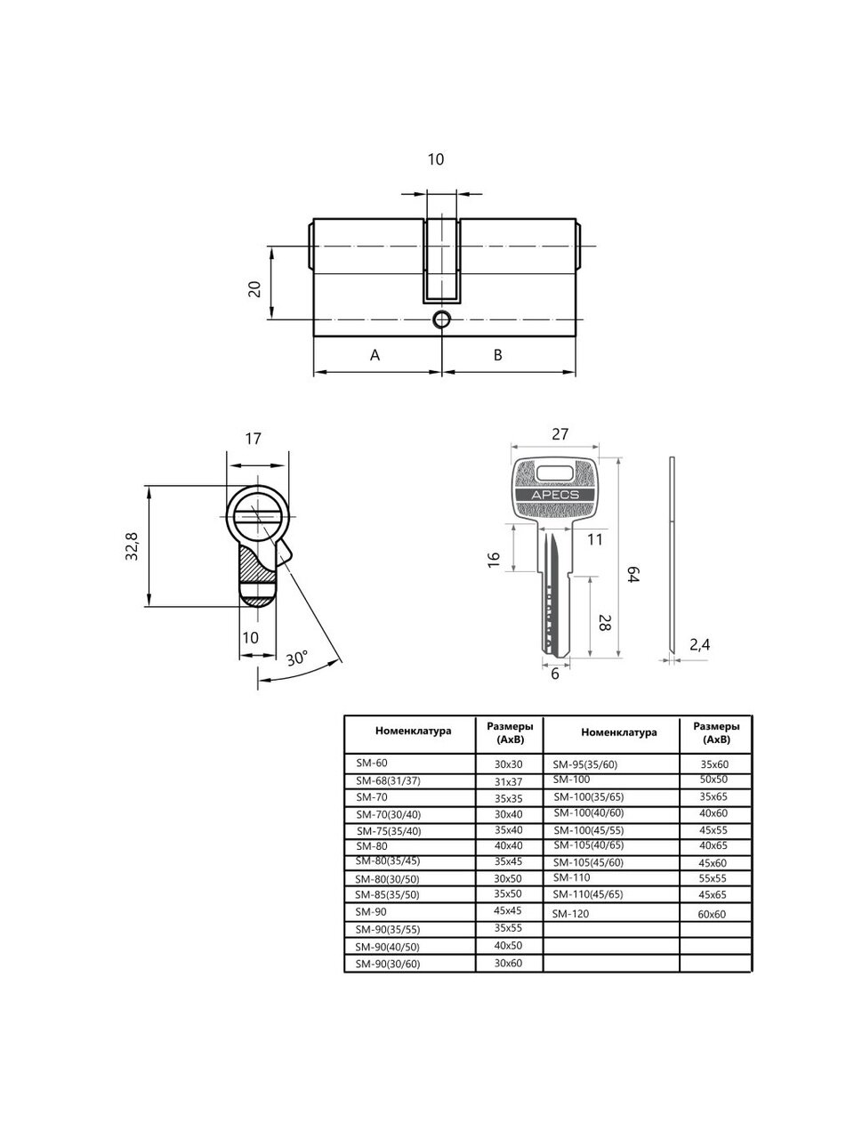 - Цилиндровые механизмы Apecs серии SM - одни из немногих существующих на рынке России цилиндров, которые прошли испытания и сертификацию в России. Серия SM предназначена для установки во входные двери и обеспечивает уровень защиты, соответствующий 2 классу (из 4 возможных) по российскому ГОСТу.