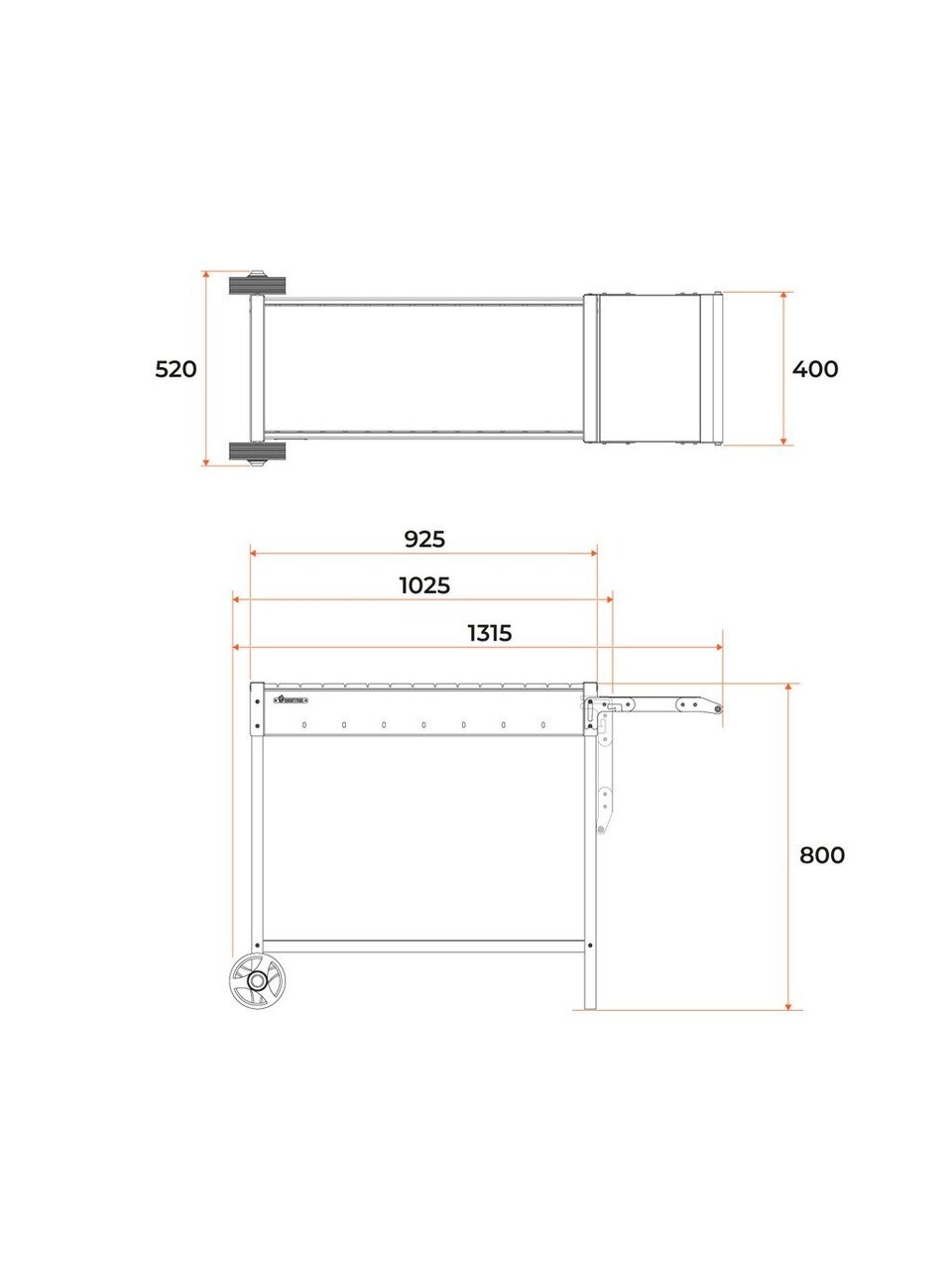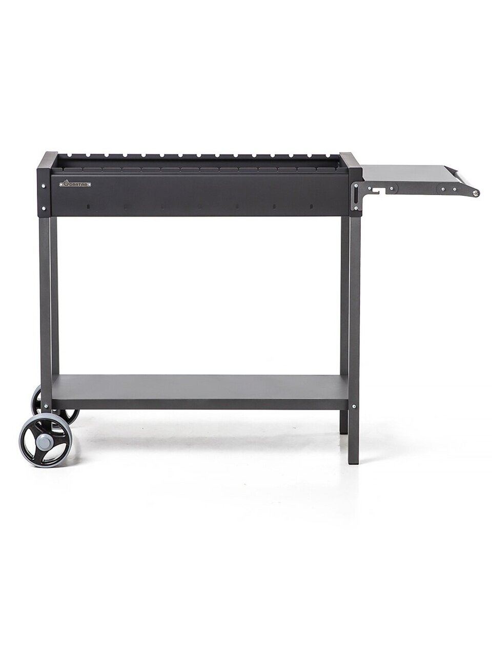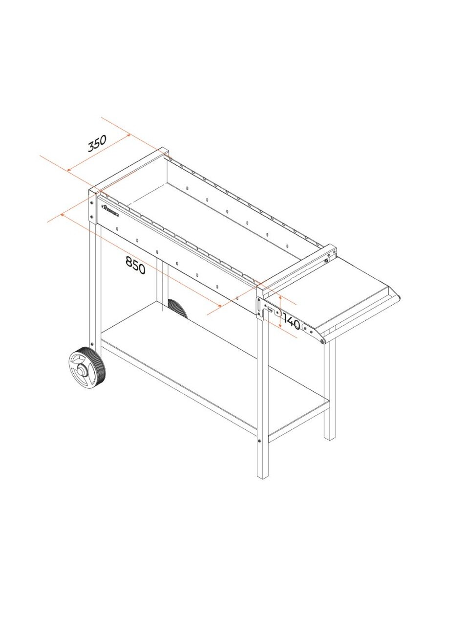 Длина 1360 мм, рабочая зона 850 мм, ширина 480 мм, высота 793 мм. Корпус — сталь 3 мм с ребрами жёсткости, в комплекте гриль и складные полки. Нет крышки, вертела, решётки и навеса.