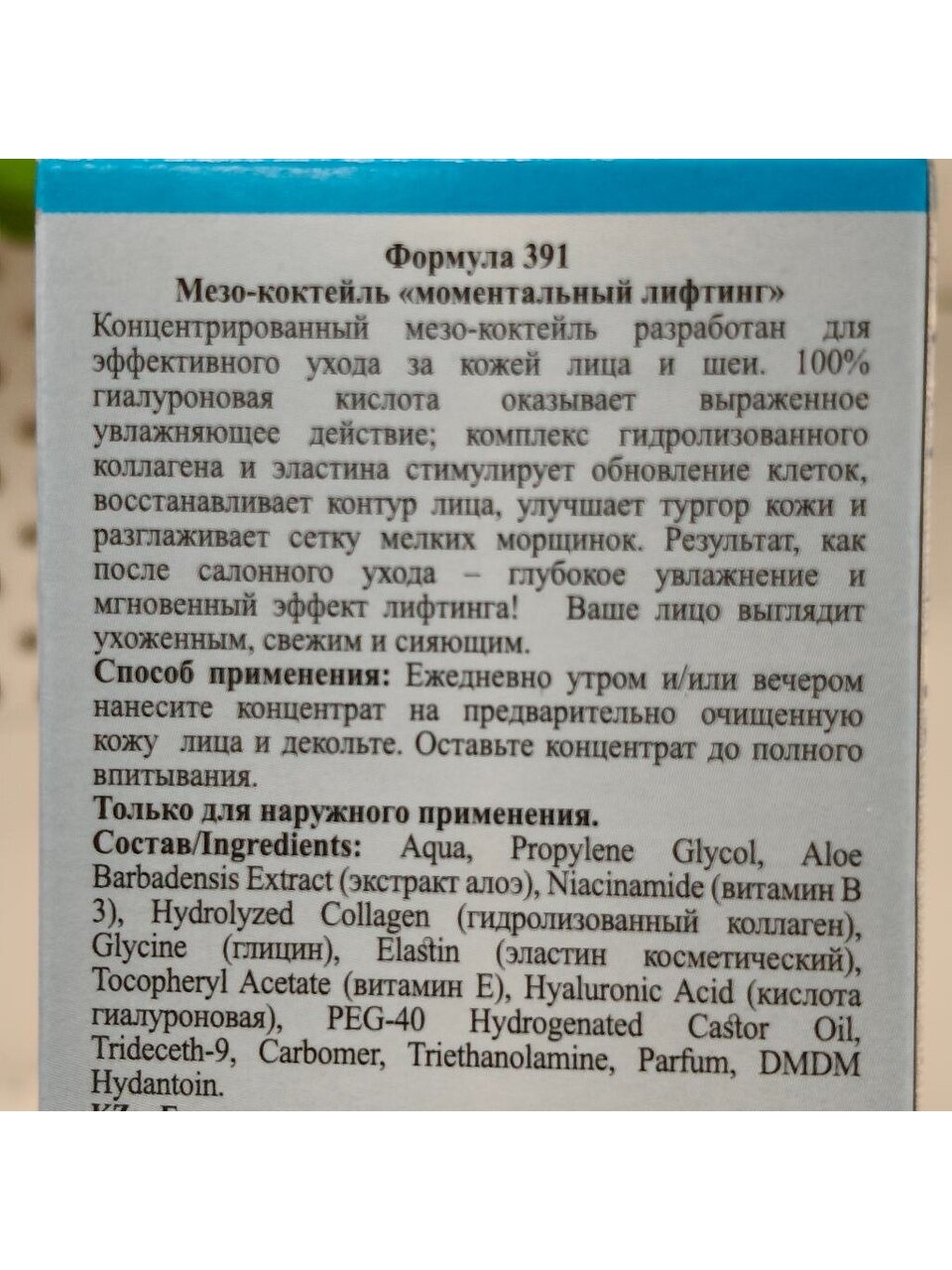 - Состав: Aqua, Propylene Glycol, Aloe Barbadensis Extract (экстракт алоэ), Niacinamide (витамин В3), Hydrolyzed Collagen (гидролизованный коллаген), Glycine (глицин), Elastin (эластин косметический), Tocopheryl Acetate (витамин Е), Hyaluronic Acid (кислота гиалуроновая), PEG-40 Hydrogenated Castor Oil, Trideceth-9, Carbomer, Triethanolamine, Parfum, DMDM Hydantoin;