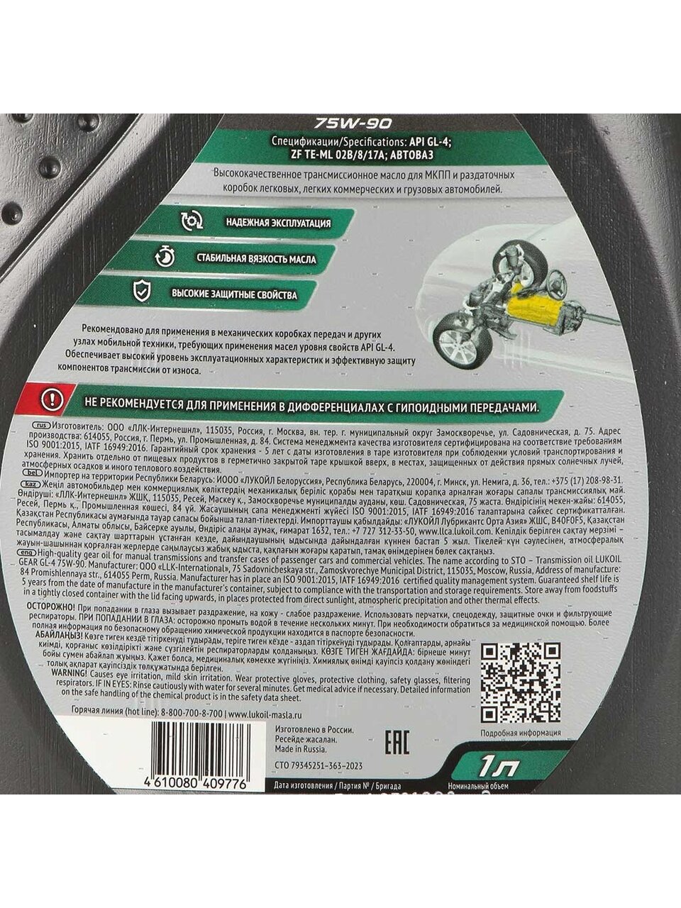 Масло трансмиссионное полусинтетическое, 75W90, Лукойл, GEAR GL-4, 1 л, 3590970