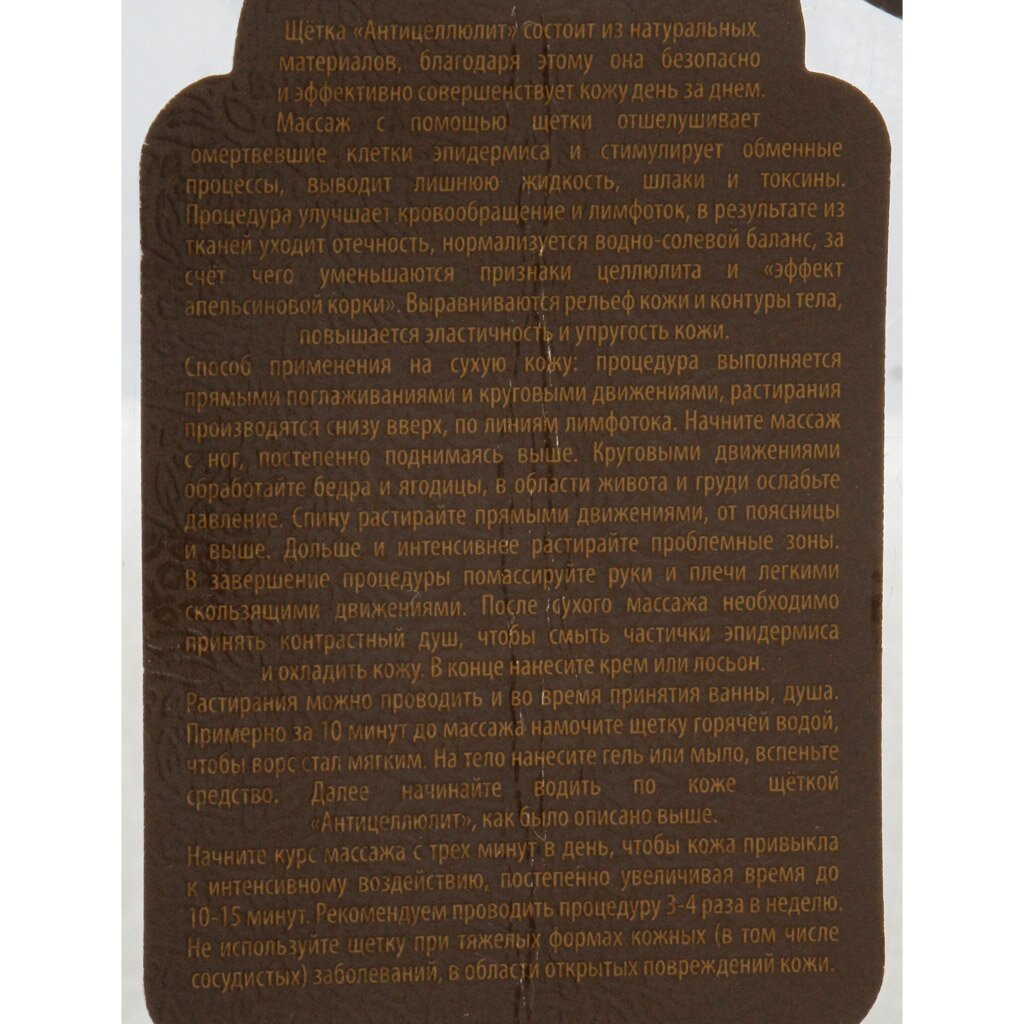- Деревянная массажная щетка: натуральный материал, безопасный для кожи, усиливает эффект антицеллюлитного массажа.