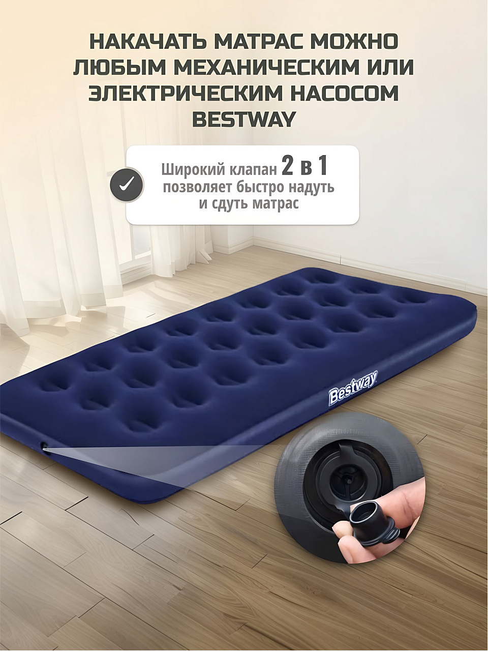 Матрас Bestway, выполненный из прочного флокированного винила, обеспечивает комфортный и здоровый сон в любых условиях. В случае, если свободного пространства в квартире или доме недостаточно, а гости наведываются часто, то надувные матрасы способны стать превосходным решением проблемы. Разместить гостей с комфортом можно на временном месте, просто надув матрас и установив его в свободном помещении.