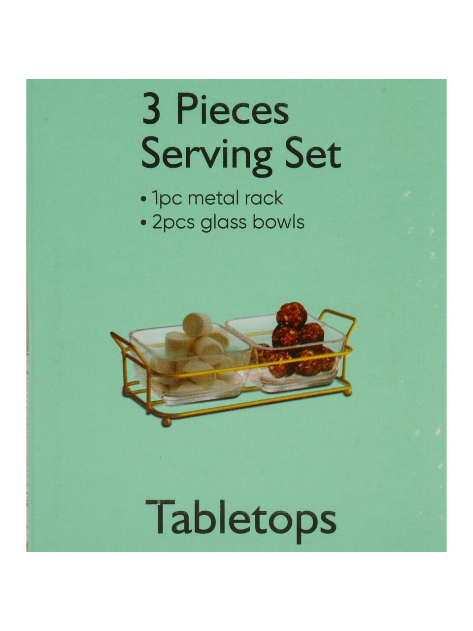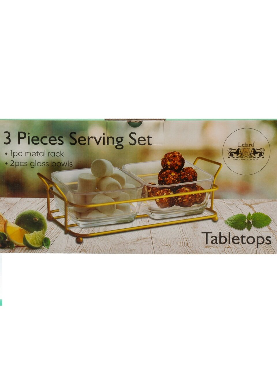 Менажница выполнена из прозрачного стекла, подставка — из металла. Оба материала устойчивы к износу и просты в уходе.