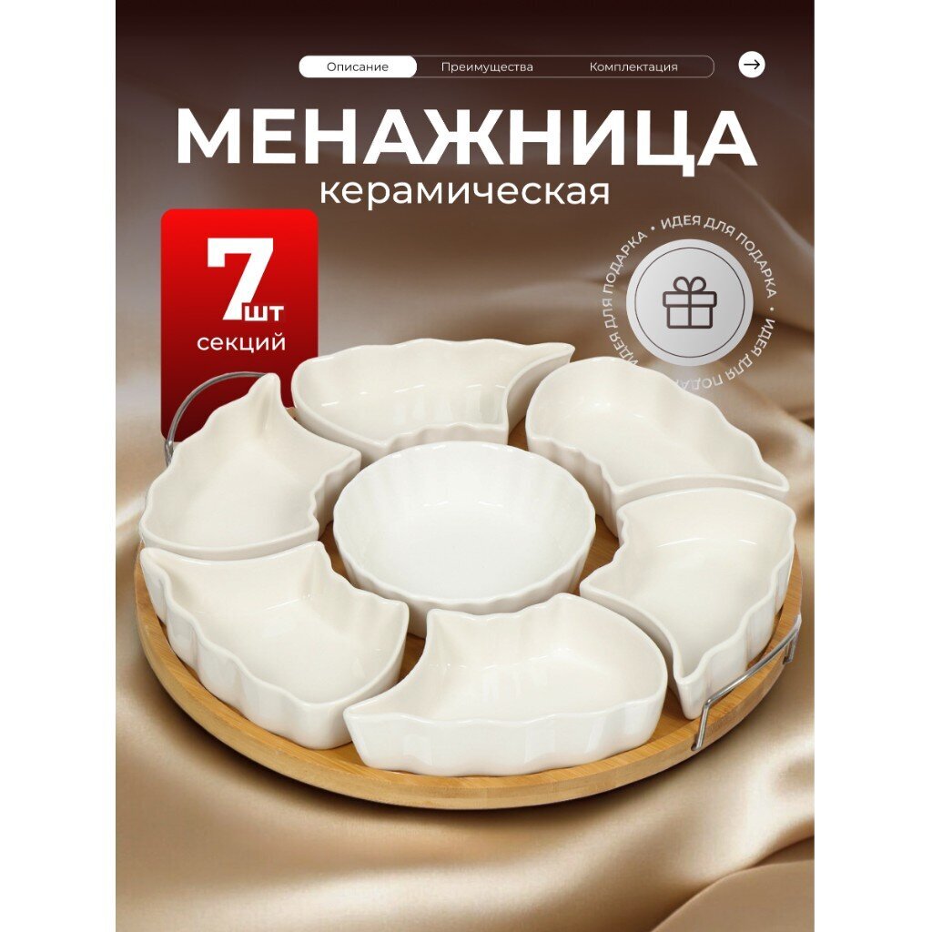 Вы можете приобрести «Менажница керамика, 29х29х4.5 см, 175 мл, 7 секций, бамбуковая подставка, белая, Y4-3606» и другие товары в нашем интернет-магазине в Брянске по низким ценам и с бесплатным самовывозом.