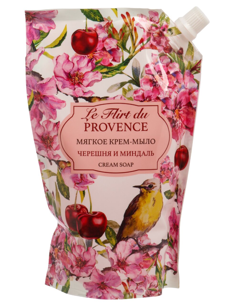 Крем-мыло Le Flirt Du Provence «Черешня и миндаль» 500 мл — мягкое очищение и уход за кожей рук, экономичный дой-пак, натуральный аромат для ежедневного комфорта.