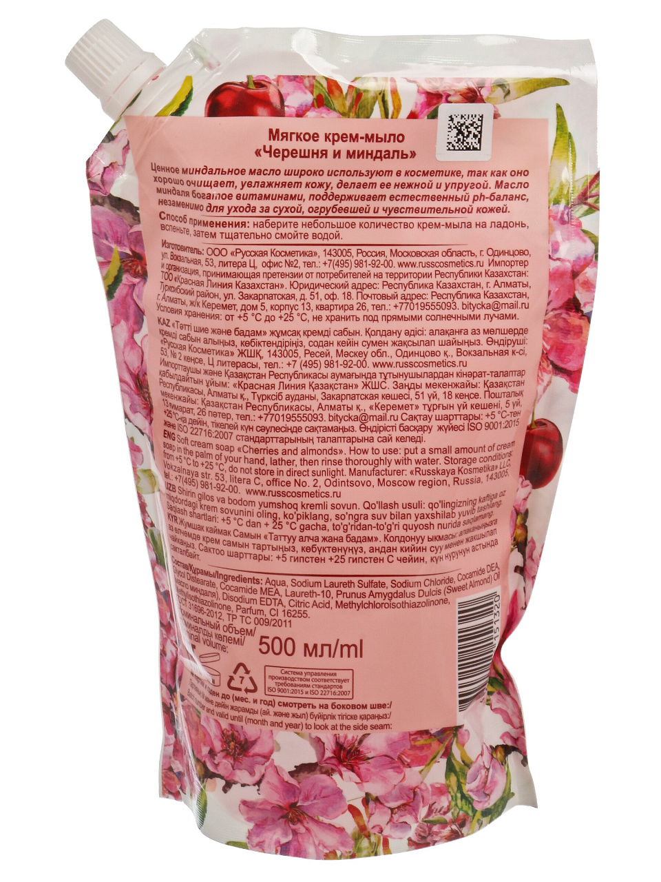 - Натуральный аромат черешни и миндаля — ощущение свежести и уюта после каждого мытья рук.