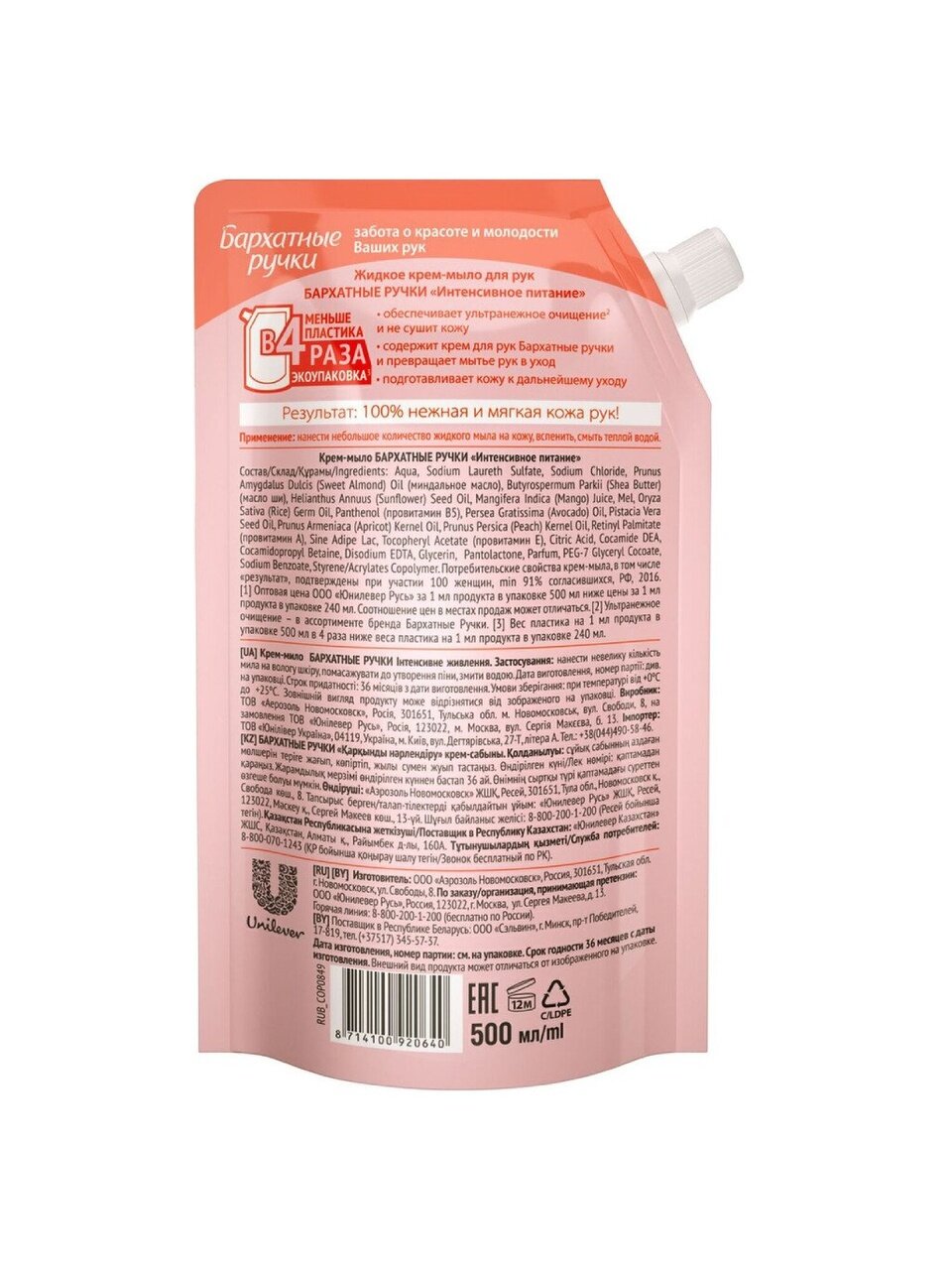 Бренд Бархатные ручки представляет жидкое крем-мыло Интенсивное питание в мягкой эко-упаковке с заботой о красоте и молодости Ваших рук! Крем-мыло содержит крем Бархатные Ручки, за счет чего обеспечивает нежное очищение и питание кожи во время мытья рук. Мыло удаляет бактерии, успешно смывая их с поверхности кожи вместе с другими ежедневными загрязнениями. Не содержит красителей. Соответствует естественному уровню pH кожи. Благодаря особой мягкой эко-упаковке используется в 4 раза меньше пластика, а цена мыла в 2 раза выгоднее по сравнению с обычной упаковкой мыла с дозатором.