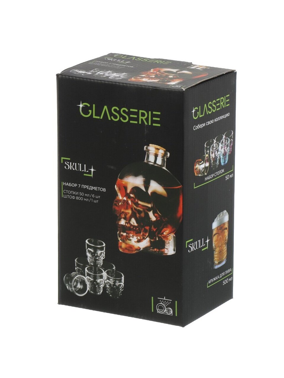 Представляем уникальный набор 7 предметов, стекло, штоф 0.8 л, стопки 50 мл 6 шт, Череп, GL002 — идеальное решение для стильных и запоминающихся вечеринок. Этот набор станет ярким акцентом на любом мероприятии и привлечет внимание благодаря своему оригинальному дизайну. Прекрасный выбор для тех, кто ценит необычные предметы интерьера и стремится выделиться.