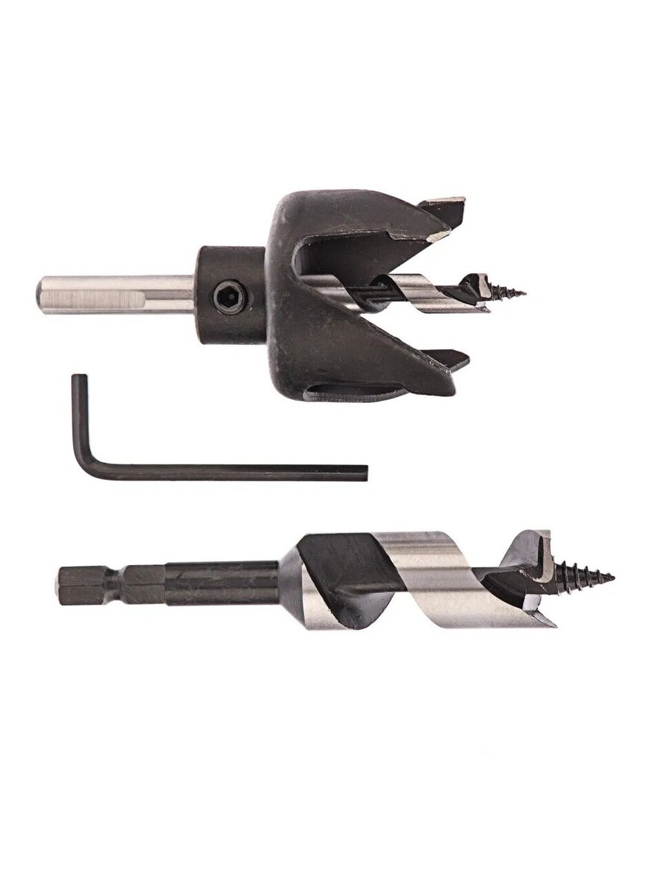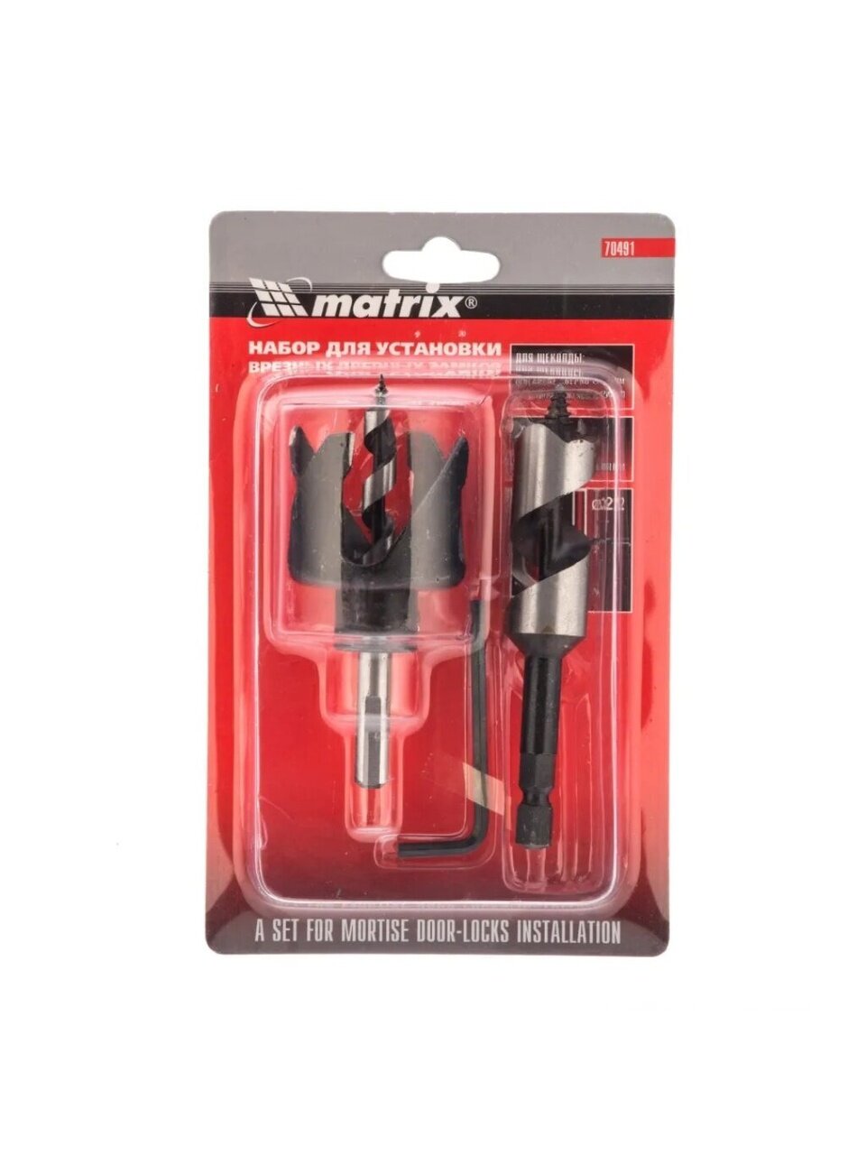 Набор для врезки замка Matrix 70491 включает в себя коронку с направляющим спиральным сверлом, ключ-шестигранник и шнековое сверло. Все инструменты изготовлены из высокопрочной углеродистой стали.