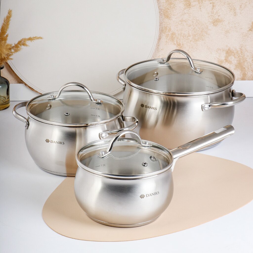 Посуда из серии Эмилия от бренда Daniks поможет Вам готовить быстро, вкусно и полезно, освободив драгоценное время для более важных дел, например, общения с близкими. Такого набора вполне достаточно для приготовления разных объемов пищи: от аппетитного супа для всей семьи до небольшой порции каши на завтрак малышу.