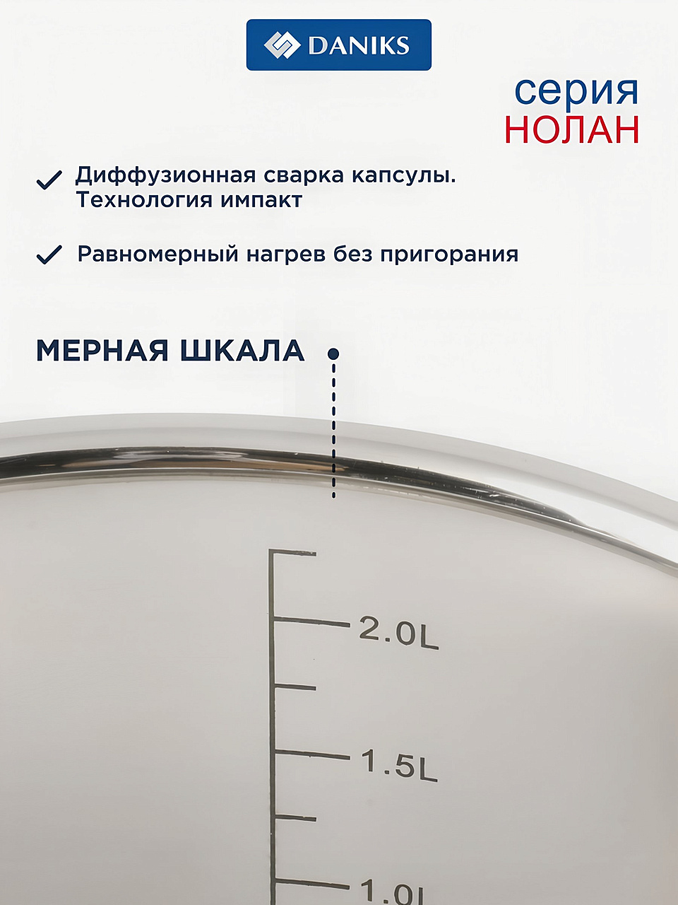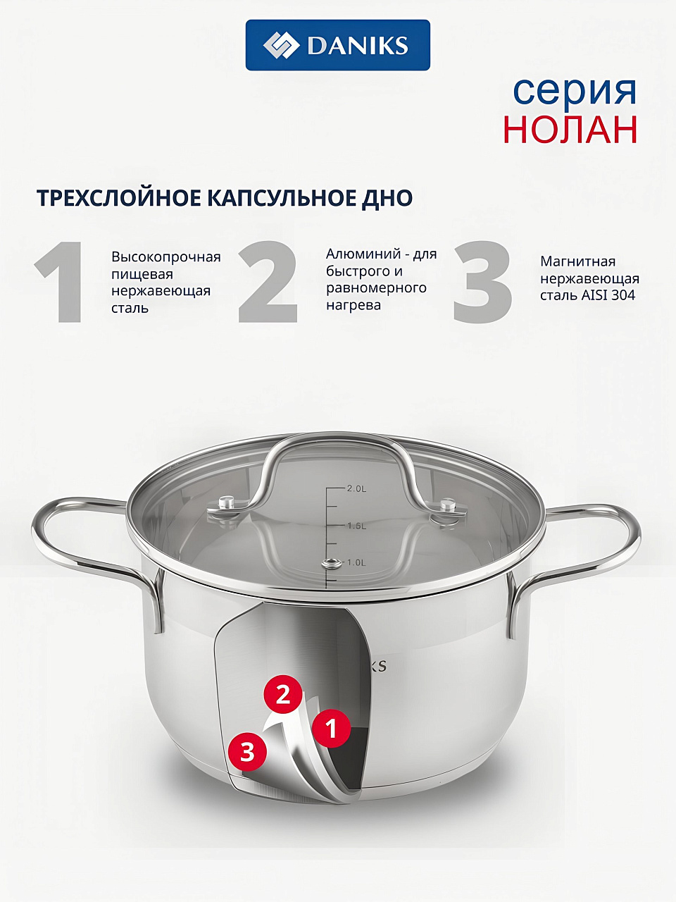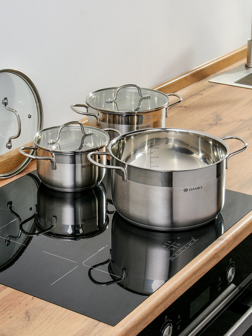 Набор кастрюль Daniks Нолан — это комплексное решение для тех, кто ищет, какую посуду выбрать для индукционной плиты, или спрашивает, что лучше для ежедневного приготовления дома и на даче. Кастрюли изготовлены из пищевой нержавеющей стали, что обеспечивает равномерный прогрев, устойчивость к царапинам и долгий срок службы. Прозрачные крышки из закалённого стекла позволяют следить за процессом готовки без потери тепла.