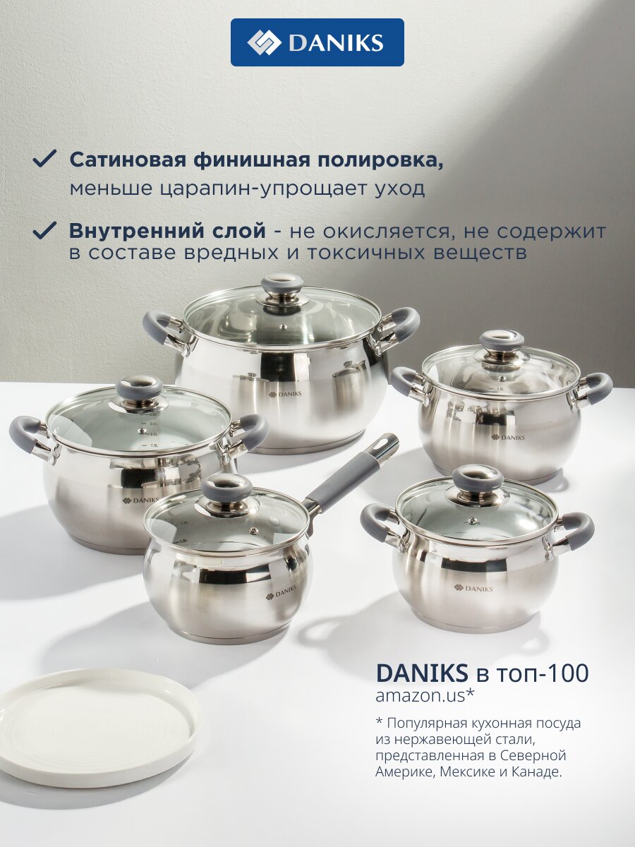 Как выбрать набор посуды для индукционной плиты? Daniks Модерн серый — это продуманный комплект из 10 предметов, где каждая кастрюля и ковш выполнены из прочной нержавеющей стали. Стеклянные крышки позволяют наблюдать за процессом готовки, а эргономичные ручки обеспечивают комфортное использование. Благодаря отсутствию антипригарного покрытия, посуда подходит для любителей классической кулинарии и легко очищается даже после активной эксплуатации.