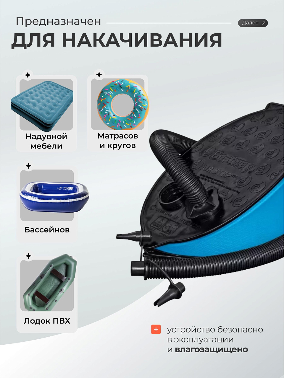 Насос ножной - это удобный и практичный инструмент, который станет незаменимым помощником во многих ситуациях. С помощью него можно легко накачать небольшие и среднего размера надувные изделия, такие как: игрушки, мячи, кровати, матрасы, лодки, бассейны с надувным верхом и т.п.