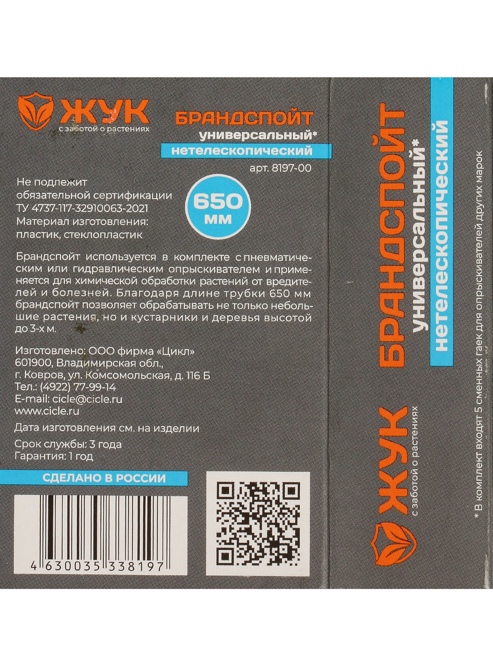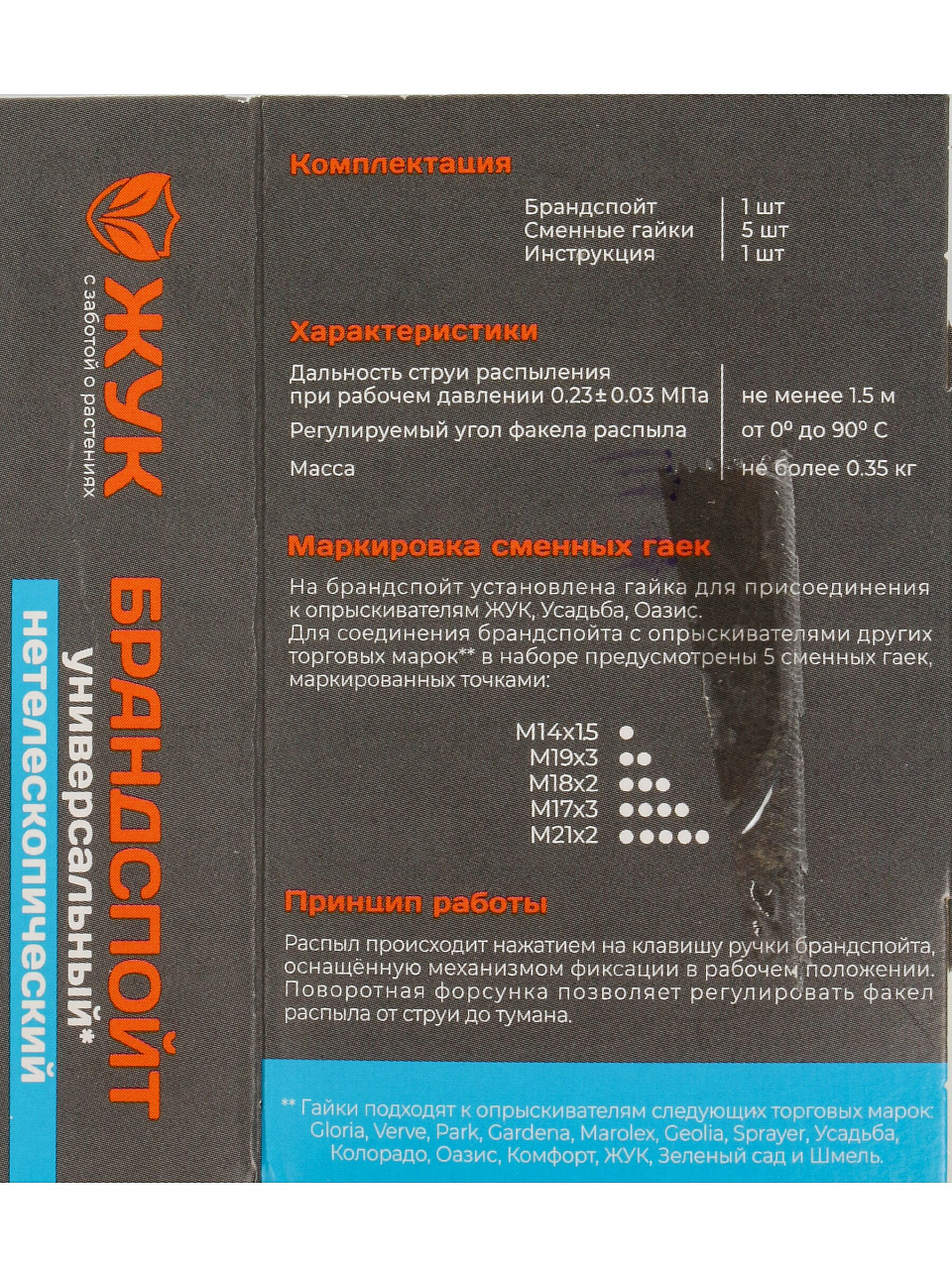 Удлинитель Жук с артикулом 8197-00 совместим с большинством опрыскивателей стандартного типа; перед покупкой уточните диаметр резьбы вашего устройства.
