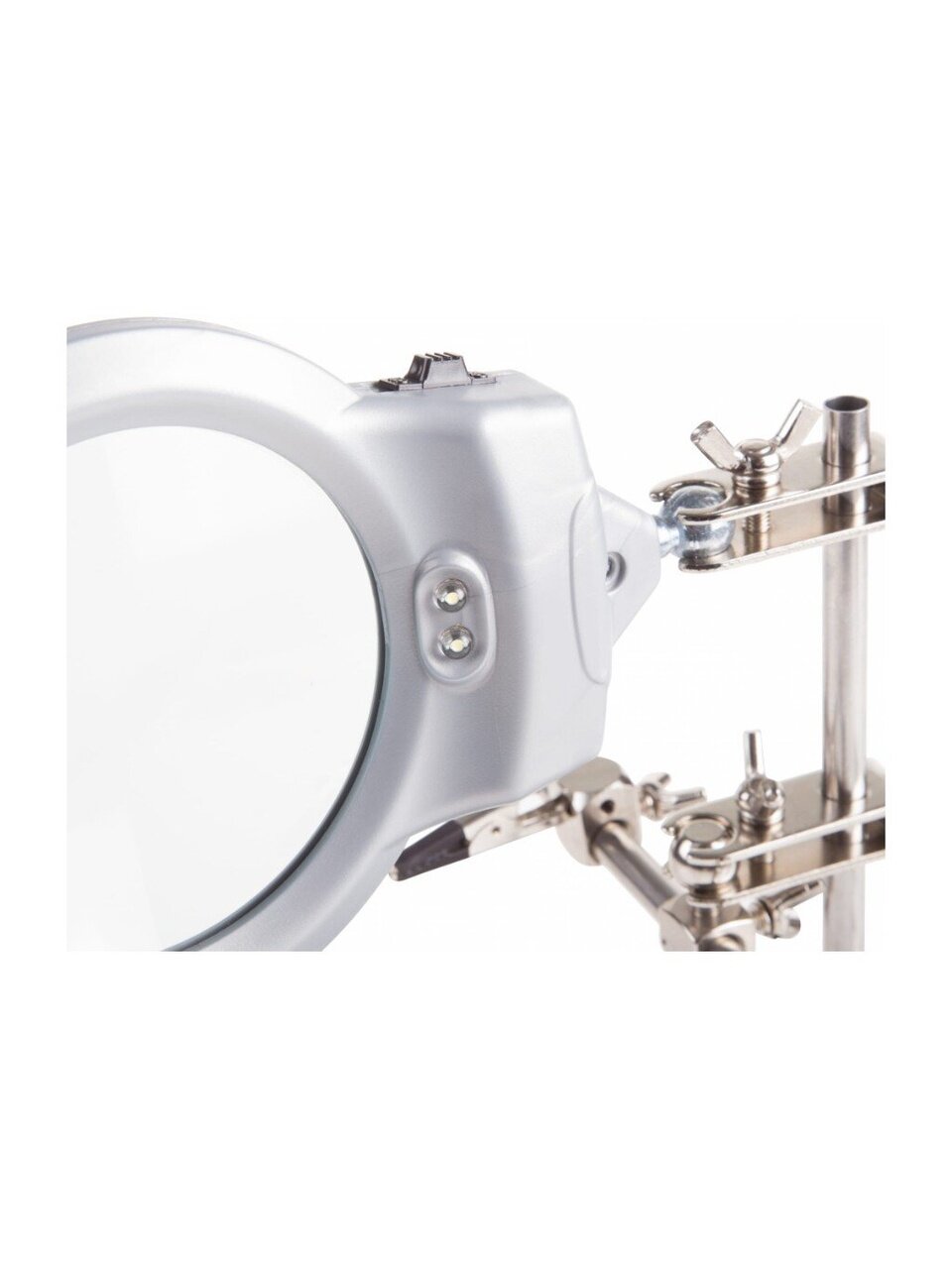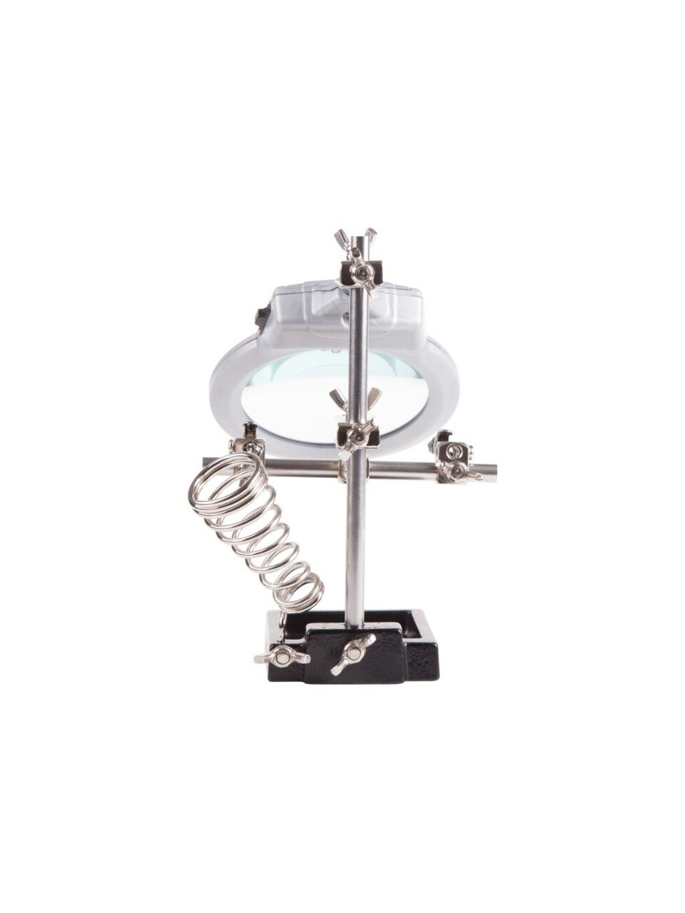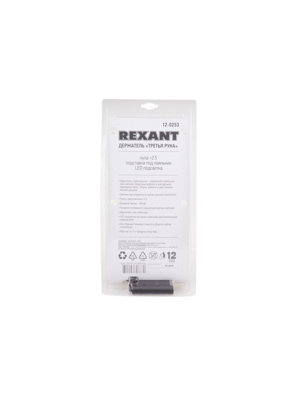 Держатель CT-293 LED (ZD-10M) REXANT 12-0253 применяется при паяльно-сборочных работах. Предназначен для зажима мелких деталей в любом нужном положении. Оснастка состоит из чугунного основания (тяжелая подставка с нишей для мелких деталей или припоя), двух подвижных зажимов типа "крокодил" с никелевым покрытием, лупы х2.5, светодиодной подсветки. Имеется возможность регулировки положения и спиралевидной подставки под паяльник с никелевым покрытием. Подсветка интегрирована в держатель линзы, работает от трех батареек типа АAA. Диаметр линзы - 85 мм.