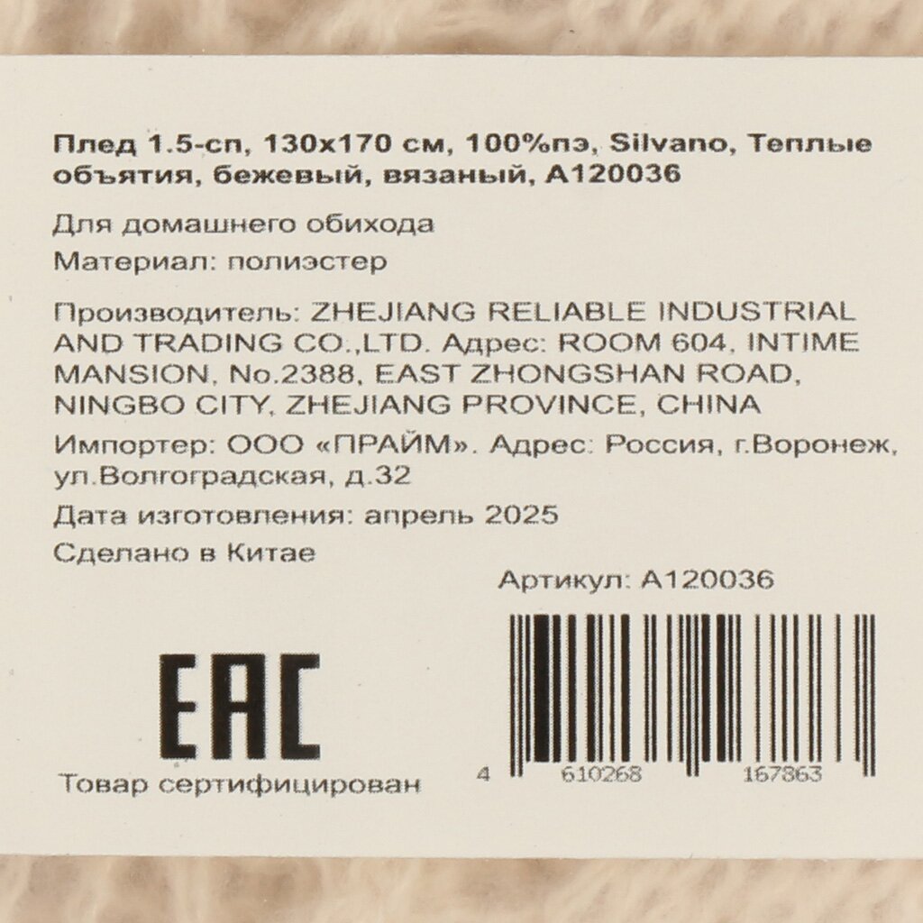 Плед 1.5-спальный 130х170 см Silvano «Теплые объятия» — уютное решение для дома и дачи: мягкий вязаный полиэстер, универсальный размер, выгодная цена.