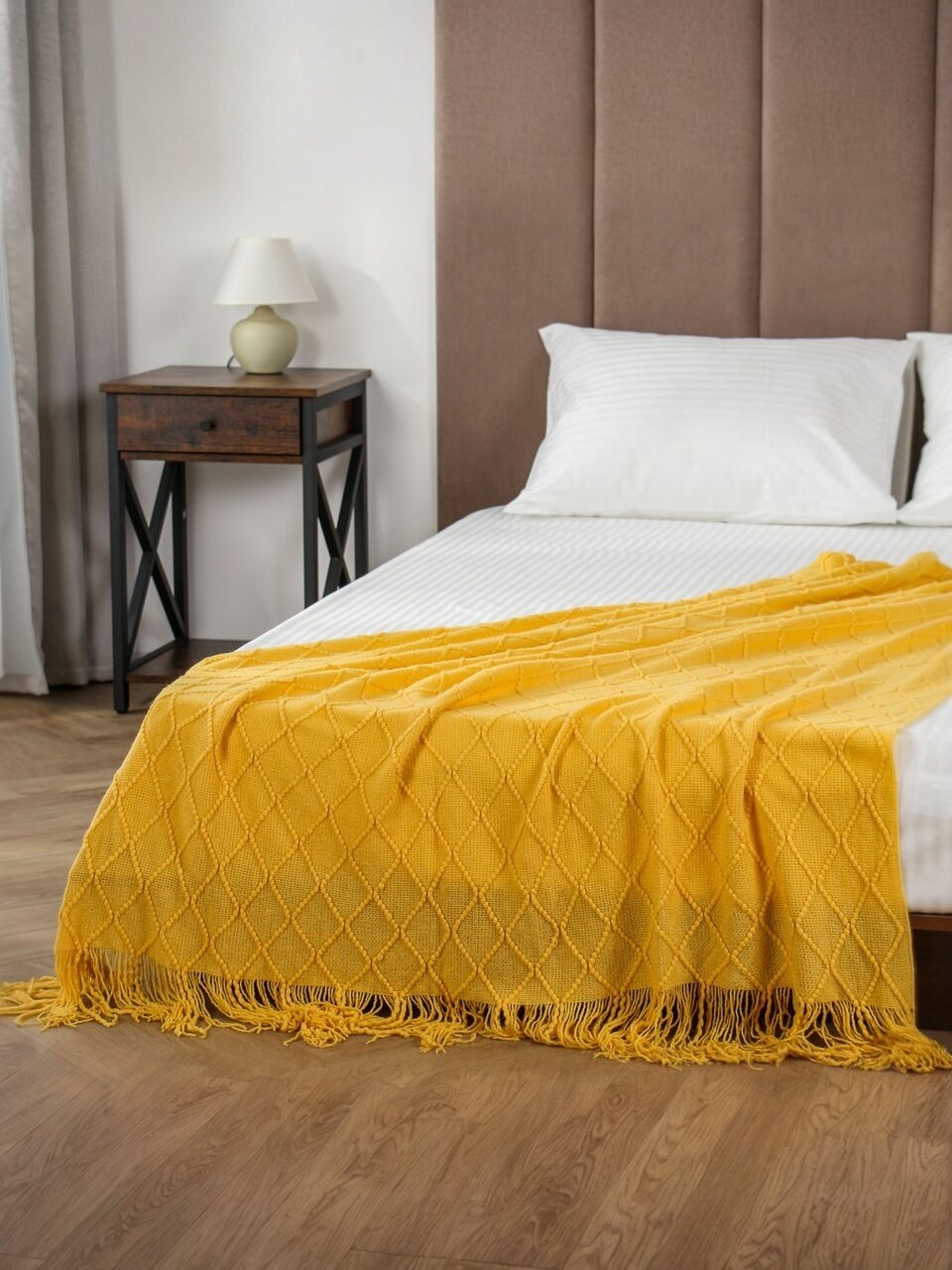 Плед 1.5-спальный Silvano «Теплые объятия» — это современное решение для тех, кто ищет недорогой и стильный плед для дома или дачи. Благодаря однотонному горчичному цвету и вязаной фактуре, он гармонично впишется в любой интерьер, а отделка бахромой добавит уюта. Если вы спрашиваете, какой плед выбрать для гостиной или спальни, обратите внимание на сочетание мягкости и легкости этого изделия — полиэстер обеспечивает приятную на ощупь поверхность без ворса и сохраняет тепло даже в прохладное время года.