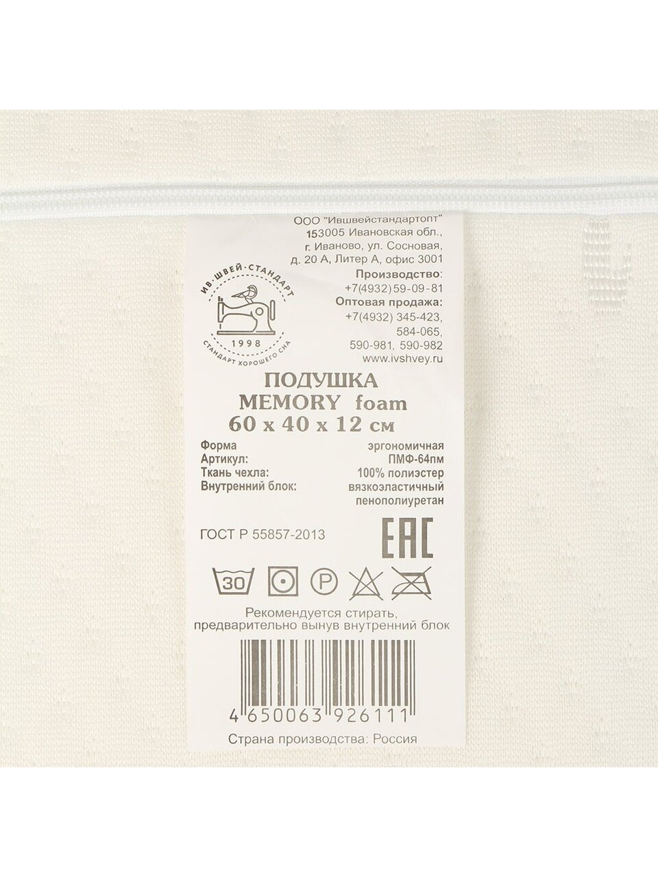 Вы можете приобрести «Подушка ортопедическая, 40 х 60 см, пенополиуретан, Memory foam, чехол 100% полиэстер, с эффектом памяти, упругая, ИвШвейСтандарт, ПМФ-64пм» и другие товары в нашем интернет-магазине в Нижнем Новгороде по низким ценам и с бесплатным самовывозом.