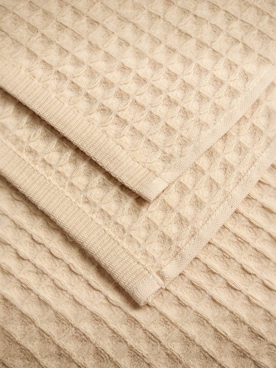Состав — 100% хлопок, плотность 290 г/м2. Вафельная фактура обеспечивает быстрое впитывание и лёгкость в уходе.
