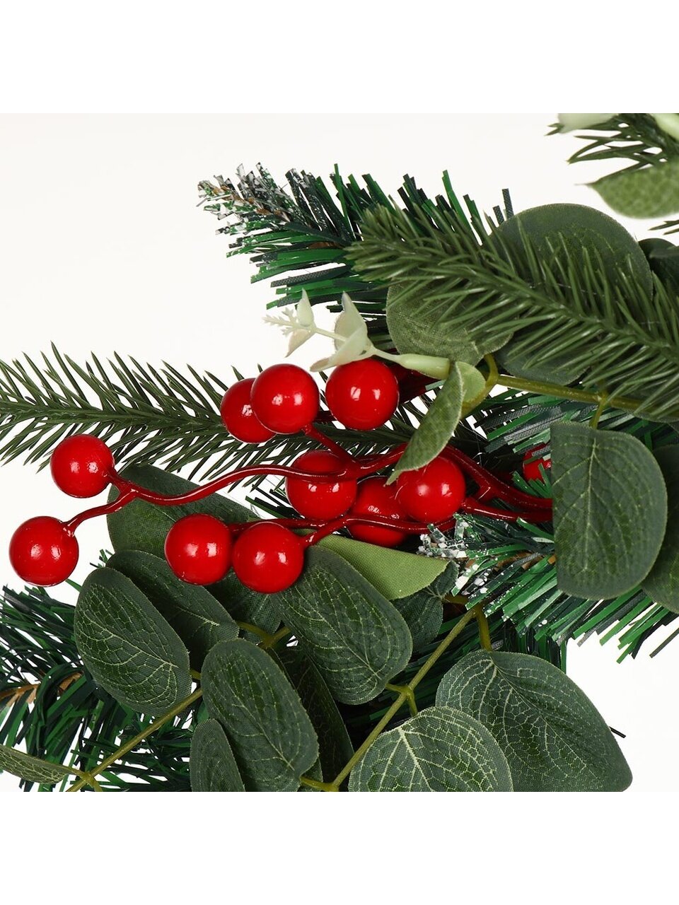 - Декор: красные искусственные ягоды, заснеженные кончики.
