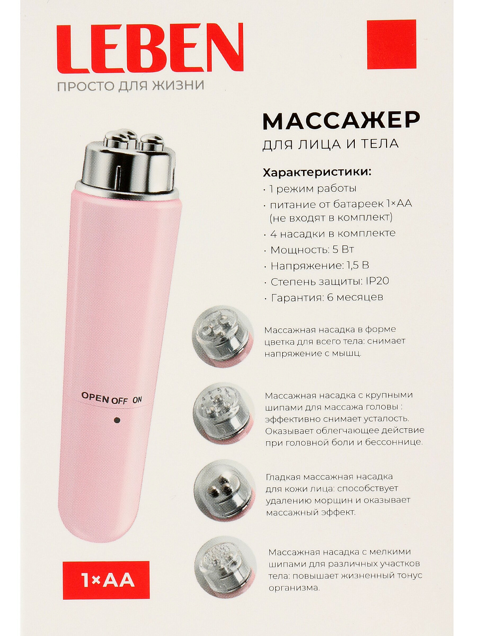 Вы можете приобрести «Массажер для лица Leben, 5 Вт, лифтинговый, вибрационный, 4 насадки, 1xAA (не в комплекте), розовые, 192-090» и другие товары в нашем интернет-магазине в Воронеже по низким ценам и с бесплатным самовывозом.